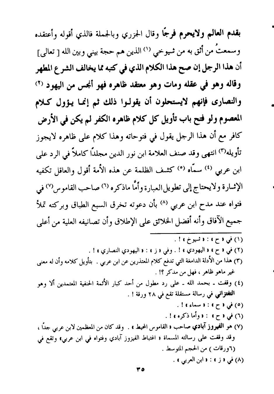 بقدم الْعَالم وَلَا يحرم فرجا وَقَالَ الْجَزرِي وَبِالْجُمْلَةِ فَالَّذِي أقوله وأعتقده وَسمعت من أَثِق بِهِ من شيوخي الَّذين هم حجَّة بيني وَبَين الله تَعَالَى أَن هَذَا الرجل إِن صَحَّ هَذَا الْكَلَام الَّذِي فِي كتبه مِمَّا يُخَالف الشَّرْع المطهر وَقَالَهُ وَهُوَ فِي عقله وَمَات وَهُوَ مُعْتَقد ظَاهره فَهُوَ أنجس من الْيَهُود وَالنَّصَارَى فَإِنَّهُم لَا يسْتَحلُّونَ أَن يَقُولُوا ذَلِك ثمَّ إِنَّمَا يؤول كَلَام الْمَعْصُوم وَلَو فتح بَاب تَأْوِيل كل كَلَام ظَاهره الْكفْر لم يكن فِي الأَرْض كَافِر مَعَ أَن هَذَا الرجل يَقُول فِي فتوحاته وَهَذَا كَلَام على ظَاهره لَا يجوز تَأْوِيله انْتهى وَقد صنف الْعَلامَة ابْن نور الدّين مجلدا كَامِلا فِي الرَّد على ابْن عَرَبِيّ سَمَّاهُ كشف الظلمَة عَن هَذِه الْأمة أَقُول والعاقل تكفيه الْإِشَارَة وَلَا يحْتَاج إِلَى تَطْوِيل الْعبارَة وَأما مَا ذكره صَاحب الْقَامُوس فِي فتواه عِنْد مدح ابْن عَرَبِيّ بِأَن دَعوته تخرق السَّبع الطباق وبركته تملأ جَمِيع الْآفَاق وَأَنه أفضل الْخَلَائق على الْإِطْلَاق وَأَن تصانيفه الْعلية من أَعلَى