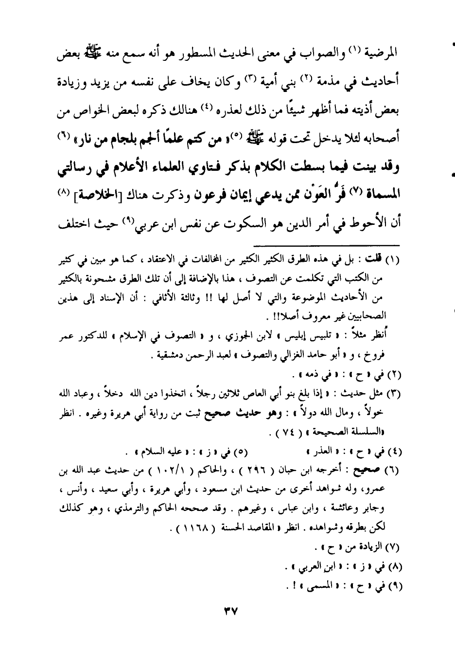 المرضية وَالصَّوَاب فِي معنى الحَدِيث المسطور هُوَ أَنه سمع مِنْهُ صلى الله عَلَيْهِ وَسلم بعض أَحَادِيث فِي مذمة بني أُميَّة وَكَانَ يخَاف على نَفسه من يزِيد وَزِيَادَة بعض أذيته فَمَا أظهر شَيْئا من ذَلِك لعذره هُنَالك ذكره لبَعض الْخَواص من أَصْحَابه لِئَلَّا يدْخل تَحت قَوْله صلى الله عَلَيْهِ وَسلم (من كتم علما ألْجم بلجام من نَار) وَقد بيّنت فِيمَا بسطت الْكَلَام بِذكر فتاوي الْعلمَاء الْأَعْلَام فِي رسالتي الْمُسَمَّاة فر العون مِمَّن يَدعِي إِيمَان فِرْعَوْن وَذكرت هُنَاكَ الْخُلَاصَة أَن الْأَحْوَط فِي أَمر الدّين هُوَ السُّكُوت عَن نفس ابْن عَرَبِيّ حَيْثُ اخْتلف
