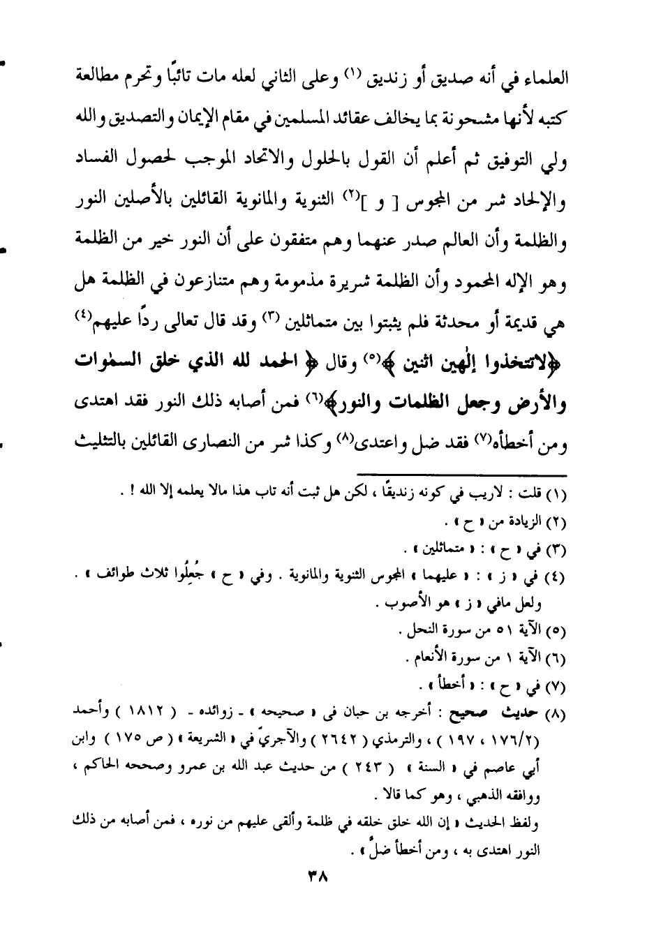 الْعلمَاء فِي أَنه صديق أَو زنديق وعَلى الثَّانِي لَعَلَّه مَاتَ تَائِبًا وَتحرم مطالعة كتبه لِأَنَّهَا مشحونة بِمَا يُخَالف عقائد الْمُسلمين فِي مقَام الْإِيمَان والتصديق وَالله ولي التَّوْفِيق ثمَّ أعلم أَن القَوْل بالحلول والاتحاد الْمُوجب لحُصُول الْفساد والإلحاد شَرّ من الْمَجُوس والثنوية والمانوية الْقَائِلين بالأصلين النُّور والظلمة وَأَن الْعَالم صدر عَنْهُمَا وهم متفقون على أَن النُّور خير من الظلمَة وَهُوَ الْإِلَه الْمَحْمُود وَأَن الظلمَة شريرة مذمومة وهم متنازعون فِي الظلمَة هَل هِيَ قديمَة أَو محدثة فَلم يثبتوا بَين متماثلين وَقد قَالَ تَعَالَى ردا عَلَيْهِم {لَا تَتَّخِذُوا إِلَهَيْنِ اثْنَيْنِ} وَقَالَ {الْحَمد لله الَّذِي خلق السَّمَاوَات وَالْأَرْض وَجعل الظُّلُمَات والنور} فَمن أَصَابَهُ ذَلِك النُّور فقد اهْتَدَى وَمن أخطأه فقد ضل واعتدى وَكَذَا شَرّ من النَّصَارَى الْقَائِلين بالتثليث