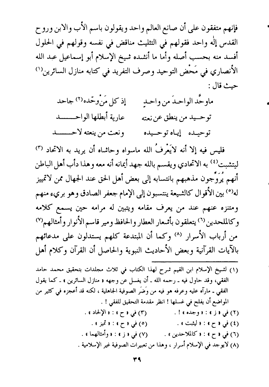 فَإِنَّهُم متفقون على أَن صانع الْعَالم وَاحِد وَيَقُولُونَ باسم الْأَب وَالِابْن وروح الْقُدس إِلَه وَاحِد فَقَوْلهم فِي التَّثْلِيث مُنَاقض فِي نَفسه وَقَوْلهمْ فِي الْحُلُول أفسد مِنْهُ بِحَسب أَصله وَأما مَا أنْشدهُ شيخ الْإِسْلَام أَبُو إِسْمَاعِيل عبد الله الْأنْصَارِيّ فِي مَحْض التَّوْحِيد وَصرف التفريد فِي كِتَابه منَازِل السائرين حَيْثُ قَالَ