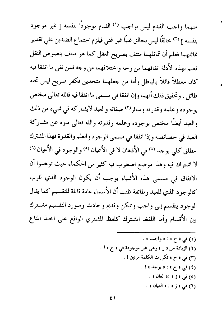مِنْهُمَا وَاجِب الْقدَم لَيْسَ بِوَاجِب الْقدَم مَوْجُودا بِنَفسِهِ غير مَوْجُود بِنَفسِهِ خَالِقًا لَيْسَ بخالق غَنِيا غير غَنِي فَيلْزم اجْتِمَاع الضدين على تَقْدِير تماثلهما فَعلم أَن تماثلهما مُنْتَفٍ بِصَرِيح الْعقل كَمَا هُوَ مُنْتَفٍ بنصوص النَّقْل فَعلم بِهَذِهِ الْأَدِلَّة اتِّفَاقهمَا من وَجه واختلافهما من وَجه فَمن نفى مَا اتفقَا فِيهِ كَانَ معطلا قَائِلا بِالْبَاطِلِ وَأما من جَعلهمَا متحدين فَكفر صَرِيح لَيْسَ تَحْتَهُ طائل وَتَحْقِيق ذَلِك أَنَّهُمَا وَإِن اتفقَا فِي مُسَمّى مَا اتفقَا فِيهِ فَالله تَعَالَى مُخْتَصّ بِوُجُودِهِ وَعلمه وَقدرته وَسَائِر صِفَاته وَالْعَبْد لَا يُشَارِكهُ فِي شَيْء من ذَلِك وَالْعَبْد أَيْضا مُخْتَصّ بِوُجُودِهِ وَعلمه وَقدرته وَالله تَعَالَى منزه عَن مُشَاركَة العَبْد فِي خَصَائِصه وَإِذا اتفقَا فِي مُسَمّى الْوُجُود وَالْعلم وَالْقُدْرَة فَهَذَا الْمُشْتَرك مُطلق كلي يُوجد فِي الأذهان لَا فِي الْأَعْيَان والوجود فِي الْأَعْيَان لَا اشْتِرَاك فِيهِ وَهَذَا مَوضِع اضْطِرَاب فِيهِ كثير من الْحُكَمَاء حَيْثُ توهموا أَن الِاتِّفَاق فِي مُسَمّى هَذِه الْأَشْيَاء يُوجب أَن يكون الْوُجُود الَّذِي للرب كالوجود الَّذِي للْعَبد وَطَائِفَة ظنت أَن الْأَسْمَاء عَامَّة قَابِلَة للتقسيم كَمَا يُقَال الْوُجُود يَنْقَسِم إِلَى وَاجِب وممكن وقديم وحادث ومورد التَّقْسِيم مُشْتَرك بَين الْأَقْسَام وَأما اللَّفْظ الْمُشْتَرك كَلَفْظِ المُشْتَرِي الْوَاقِع على آخذ الْمَتَاع