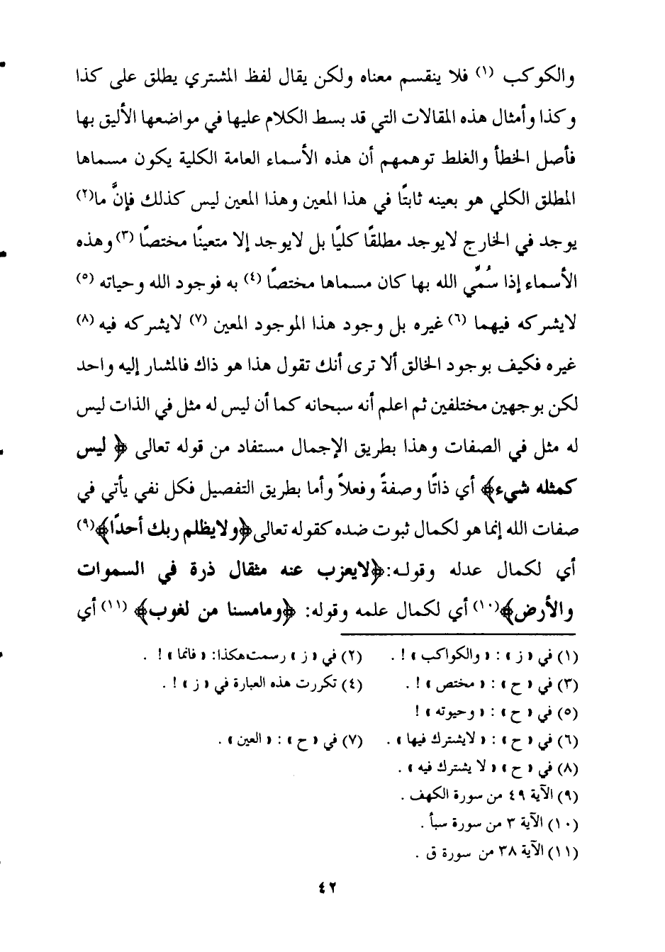 والكوكب فَلَا يَنْقَسِم مَعْنَاهُ وَلَكِن يُقَال لفظ المُشْتَرِي يُطلق على كَذَا وَكَذَا وأمثال هَذِه المقالات الَّتِي قد بسط الْكَلَام عَلَيْهَا فِي موَاضعهَا الْأَلْيَق بهَا فَأصل الْخَطَأ والغلط توهمهم أَن هَذِه الْأَسْمَاء الْعَامَّة الْكُلية يكون مسماها الْمُطلق الْكُلِّي هُوَ بِعَيْنِه ثَابتا فِي هَذَا الْمعِين وَهَذَا الْمعِين لَيْسَ كَذَلِك فَإِن مَا يُوجد فِي الْخَارِج لَا يُوجد مُطلقًا كليا بل لَا يُوجد إِلَّا مُتَعَيّنا مُخْتَصًّا وَهَذِه الْأَسْمَاء إِذا سمي الله بهَا كَانَ مسماها مُخْتَصًّا بِهِ فوجود الله وحياته لَا يشركهُ فيهمَا غَيره بل وجود هَذَا الْمَوْجُود الْمعِين لَا يشركهُ فِيهِ غَيره فَكيف بِوُجُود الْخَالِق أَلا ترى أَنَّك تَقول هَذَا هُوَ ذَاك فالمشار إِلَيْهِ وَاحِد لَكِن بِوَجْهَيْنِ مُخْتَلفين ثمَّ اعْلَم أَنه سُبْحَانَهُ كَمَا أَن لَيْسَ لَهُ مثل فِي الذَّات لَيْسَ لَهُ مثل فِي الصِّفَات وَهَذَا بطرِيق الْإِجْمَال مُسْتَفَاد من قَوْله تَعَالَى {لَيْسَ كمثله شَيْء} أَي ذاتا وَصفَة وفعلا وَأما بطرِيق التَّفْصِيل فَكل نفي يَأْتِي فِي صِفَات الله إِنَّمَا هُوَ لكَمَال ثُبُوت ضِدّه كَقَوْلِه تَعَالَى {وَلَا يظلم رَبك أحدا} أَي لكَمَال عدله وَقَوله {لَا يعزب عَنهُ مِثْقَال ذرة فِي السَّمَاوَات وَلَا فِي الأَرْض} أَي لكَمَال علمه وَقَوله {وَمَا مسنا من لغوب} أَي