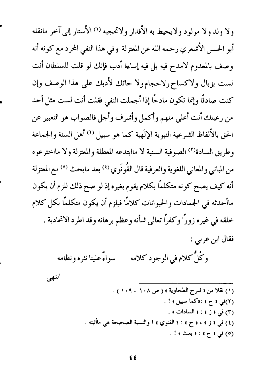 وَلَا ولد وَلَا مَوْلُود وَلَا يُحِيط بِهِ الأقدار وَلَا تحجبه الأستار إِلَى آخر مَا نَقله أَبُو الْحسن الْأَشْعَرِيّ رَحمَه الله عَن الْمُعْتَزلَة وَفِي هَذَا النَّفْي الْمُجَرّد مَعَ كَونه أَنه وصف بالمعدوم لَا مدح فِيهِ بل فِيهِ إساءة أدب فَإنَّك لَو قلت للسُّلْطَان أَنْت لست بزبال وَلَا كساح وَلَا حجام وَلَا حائك لأدبك على هَذَا الْوَصْف وَإِن كنت صَادِقا وَإِنَّمَا تكون مادحا إِذا أجملت النَّفْي فَقلت أَنْت لست مثل أحد من رعيتك أَنْت أَعلَى مِنْهُم وأكمل وأشرف وَأجل فَالصَّوَاب هُوَ التَّعْبِير عَن الْحق بالألفاظ الشَّرْعِيَّة النَّبَوِيَّة الإلهية كَمَا هُوَ سَبِيل أهل السّنة وَالْجَمَاعَة وَطَرِيق السَّادة الصُّوفِيَّة السّنيَّة لَا مَا ابتدعه المعطلة والمعتزلة وَلَا مَا اخترعوه من المباني والمعاني اللُّغَوِيَّة والعرفية قَالَ القونوي بعد مَا بحث مَعَ الْمُعْتَزلَة أَنه كَيفَ يَصح كَونه متكلما بِكَلَام يقوم بِغَيْرِهِ إِذْ لَو صَحَّ ذَلِك للَزِمَ أَن يكون مَا أحدثه فِي الجمادات والحيوانات كلَاما فَيلْزم أَن يكون متكلما بِكُل كَلَام خلقه فِي غَيره زورا وَكفرا تَعَالَى شَأْنه وَعظم برهانه وَقد اطرد الاتحادية فَقَالَ ابْن عَرَبِيّ