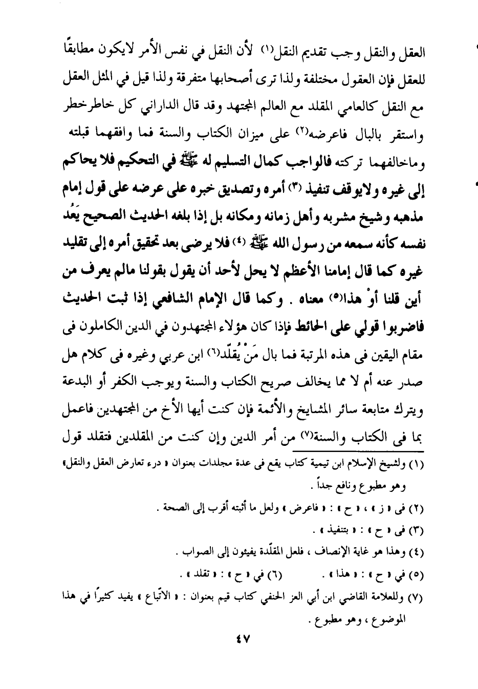 الْعقل وَالنَّقْل وَجب تَقْدِيم النَّقْل لِأَن النَّقْل فِي نفس الْأَمر لَا يكون مطابقا لِلْعَقْلِ فَإِن الْعُقُول مُخْتَلفَة وَلذَا ترى أَصْحَابهَا مُتَفَرِّقَة وَلذَا قيل فِي الْمثل الْعقل مَعَ النَّقْل كالعامي الْمُقَلّد مَعَ الْعَالم الْمُجْتَهد وَقد قَالَ الدَّارَانِي كل خاطر خطر وَاسْتقر بالبال فاعرضه على ميزَان الْكتاب وَالسّنة فَمَا وافقهما قبلته وَمَا خالفهما تركته فَالْوَاجِب كَمَال التَّسْلِيم لَهُ صلى الله عَلَيْهِ وَسلم فِي التَّحْكِيم فَلَا يحاكم إِلَى غَيره وَلَا يُوقف تَنْفِيذ أمره وتصديق خَبره على عرضه على قَول إِمَام مذْهبه وَشَيخ مشربه وَأهل زَمَانه ومكانه بل إِذا بلغه الحَدِيث الصَّحِيح يعد نَفسه كَأَنَّهُ سَمعه من رَسُول الله صلى الله عَلَيْهِ وَسلم فَلَا يرضى بعد تَحْقِيق أمره إِلَى تَقْلِيد غَيره كَمَا قَالَ إمامنا الْأَعْظَم لَا يحل لأحد أَن يَقُول بقولنَا مَا لم يعرف من أَيْن قُلْنَا أَو هَذَا مَعْنَاهُ وكما قَالَ الإِمَام الشَّافِعِي إِذا ثَبت الحَدِيث فاضربوا قولي على الْحَائِط فَإِذا كَانَ هَؤُلَاءِ المجتهدون فِي الدّين الكاملون فِي مقَام الْيَقِين فِي هَذِه الْمرتبَة فَمَا بَال من يُقَلّد ابْن عَرَبِيّ وَغَيره فِي كَلَام هَل صدر عَنهُ أم لَا مِمَّا يُخَالف صَرِيح الْكتاب وَالسّنة وَيُوجب الْكفْر أَو الْبِدْعَة وَيتْرك مُتَابعَة سَائِر الْمَشَايِخ وَالْأَئِمَّة فَإِن كنت أَيهَا الْأَخ من الْمُجْتَهدين فاعمل بِمَا فِي الْكتاب وَالسّنة من أَمر الدّين وَإِن كنت من المقلدين فتقلد قَول