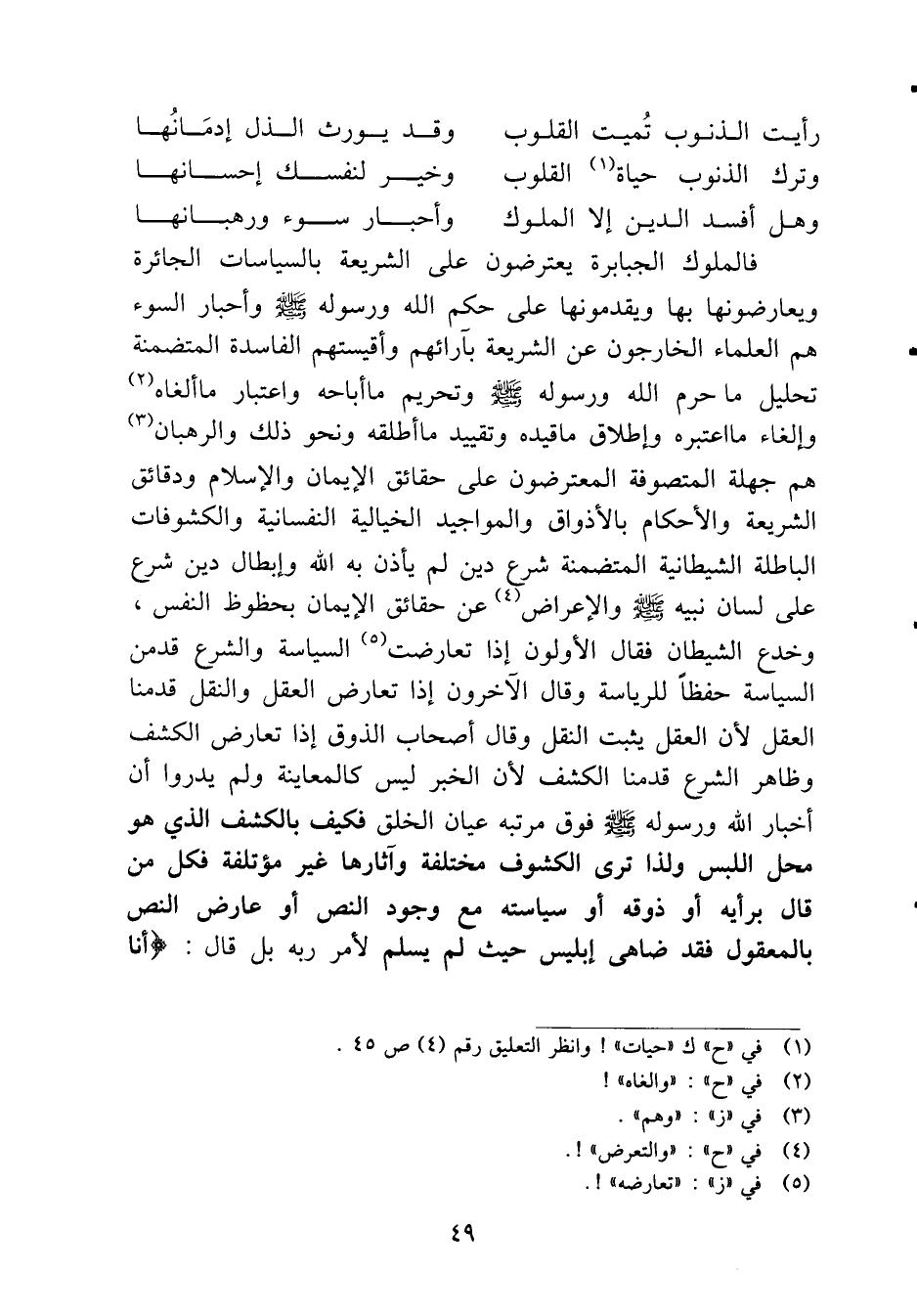 فالملوك الْجَبَابِرَة يعترضون على الشَّرِيعَة بالسياسات الجائرة ويعارضونها بهَا ويقدمونها على حكم الله وَرَسُوله صلى الله عَلَيْهِ وَسلم وأحبار السوء هم الْعلمَاء الخارجون عَن الشَّرِيعَة بآرائهم وأقيستهم الْفَاسِدَة المتضمنة تَحْلِيل مَا حرم الله وَرَسُوله صلى الله عَلَيْهِ وَسلم وَتَحْرِيم مَا أَبَاحَهُ وَاعْتِبَار مَا ألغاه وإلغاء مَا اعْتَبرهُ وَإِطْلَاق مَا قَيده وَتَقْيِيد مَا أطلقهُ وَنَحْو ذَلِك والرهبان هم جهلة المتصوفة المعترضون على حقائق الْإِيمَان وَالْإِسْلَام ودقائق الشَّرِيعَة وَالْأَحْكَام بالأذواق والمواجيد الخيالية النفسانية والكشوفات الْبَاطِلَة الشيطانية المتضمنة شرع دين لم يَأْذَن بِهِ الله وَإِبْطَال دين شرع على لِسَان نبيه صلى الله عَلَيْهِ وَسلم والإعراض عَن حقائق الْإِيمَان بحظوظ النَّفس وخدع الشَّيْطَان فَقَالَ الْأَولونَ إِذا تَعَارَضَت السياسة وَالشَّرْع قدمنَا السياسة حفظا للرياسة وَقَالَ الْآخرُونَ إِذا تعَارض الْعقل وَالنَّقْل قدمنَا الْعقل لِأَن الْعقل يثبت النَّقْل وَقَالَ أَصْحَاب الذَّوْق إِذا تعَارض الْكَشْف وَظَاهر الشَّرْع قدمنَا الْكَشْف لِأَن الْخَبَر لَيْسَ كالمعاينة وَلم يدروا أَن أَخْبَار الله وَرَسُوله صلى الله عَلَيْهِ وَسلم فَوق مرتبه عيان الْخلق فَكيف بالكشف الَّذِي هُوَ مَحل اللّبْس وَلذَا ترى الكشوف مُخْتَلفَة وآثارها غير مؤتلفة فَكل من قَالَ بِرَأْيهِ أَو ذوقه أَو سياسته مَعَ وجود النَّص أَو عَارض النَّص بالمعقول فقد ضاهى إِبْلِيس حَيْثُ لم يسلم لأمر ربه بل قَالَ {أَنا خير مِنْهُ خلقتني من نَار وخلقته من طين}