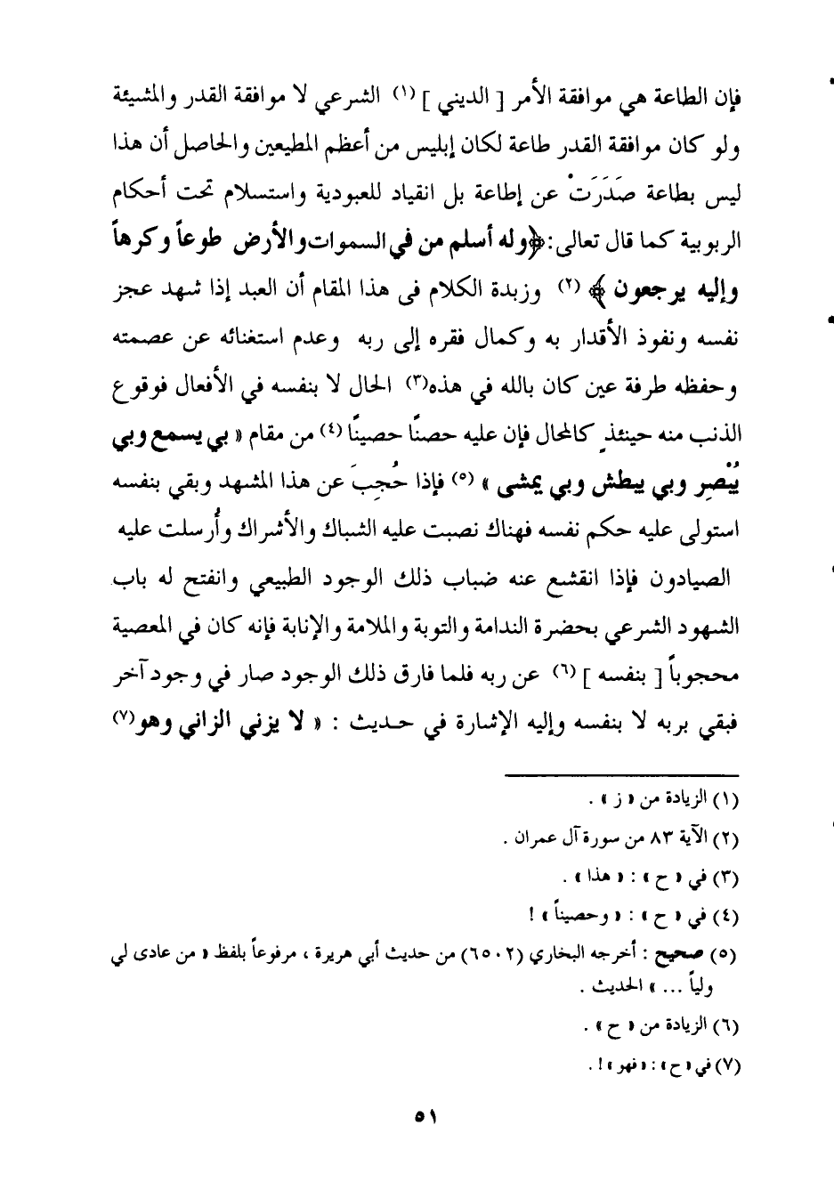 فَإِن الطَّاعَة هِيَ مُوَافقَة الْأَمر الديني الشَّرْعِيّ لَا مُوَافقَة الْقدر والمشيئة وَلَو كَانَ مُوَافقَة الْقدر طَاعَة لَكَانَ إِبْلِيس من أعظم المطيعين وَالْحَاصِل أَن هَذَا لَيْسَ بِطَاعَة صدرت عَن إطاعة بل انقياد للعبودية واستسلام تَحت أَحْكَام الربوبية كَمَا قَالَ تَعَالَى {وَله أسلم من فِي السَّمَاوَات وَالْأَرْض طَوْعًا وَكرها وَإِلَيْهِ يرجعُونَ} وزبدة الْكَلَام فِي هَذَا الْمقَام أَن العَبْد إِذا شهد عجز نَفسه ونفوذ الأقدار بِهِ وَكَمَال فقره إِلَى ربه وَعدم استغنائه عَن عصمته وَحفظه طرفَة عين كَانَ بِاللَّه فِي هَذِه الْحَال لَا بِنَفسِهِ فِي الْأَفْعَال فوقوع الذَّنب مِنْهُ حِينَئِذٍ كالمحال فَإِن عَلَيْهِ حصنا حصينا من مقَام (بِي يسمع وَبِي يبصر وَبِي يبطش وَبِي يمشي) فَإِذا حجب عَن هَذَا المشهد وَبَقِي بِنَفسِهِ استولى عَلَيْهِ حكم نَفسه فهناك نصبت عَلَيْهِ الشباك والأشراك وَأرْسلت عَلَيْهِ الصيادون فَإِذا انقشع عَنهُ ضباب ذَلِك الْوُجُود الطبيعي وَانْفَتح لَهُ بَاب الشُّهُود الشَّرْعِيّ بِحَضْرَة الندامة وَالتَّوْبَة والملامة والإنابة فَإِنَّهُ كَانَ فِي الْمعْصِيَة محجوبا بِنَفسِهِ عَن ربه فَلَمَّا فَارق ذَلِك الْوُجُود صَار فِي وجود آخر فَبَقيَ بربه لَا بِنَفسِهِ وَإِلَيْهِ الْإِشَارَة فِي حَدِيث (لَا يَزْنِي الزَّانِي وَهُوَ