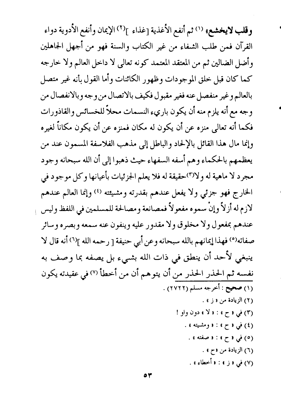 وقلب لَا يخشع) ثمَّ أَنْفَع الأغذية غذَاء الْإِيمَان وأنفع الْأَدْوِيَة دَوَاء الْقُرْآن فَمن طلب الشِّفَاء من غير الْكتاب وَالسّنة فَهُوَ من أَجْهَل الْجَاهِلين وأضل الضَّالّين ثمَّ من المعتقد الْمُعْتَمد كَونه تَعَالَى لَا دَاخل الْعَالم وَلَا خَارجه كَمَا كَانَ قبل خلق الموجودات وَظُهُور الكائنات وَأما القَوْل بِأَنَّهُ غير مُتَّصِل بالعالم وَغير مُنْفَصِل عَنهُ فَغير مَقْبُول فَكيف بالاتصال من وَجه وبالانفصال من وَجه مَعَ أَنه يلْزم مِنْهُ أَن يكون بارئ النسمات محلا للخسائس والقاذورات فَكَمَا أَنه تَعَالَى منزه عَن أَن يكون لَهُ مَكَان فمنزه عَن أَن يكون مَكَانا لغيره وَإِنَّمَا مَال هَذَا الْقَائِل بالإلحاد وَالْبَاطِل إِلَى مَذْهَب الفلاسفة المسمون عِنْد من يعظمهم بالحكماء وهم أسفه السُّفَهَاء حَيْثُ ذَهَبُوا إِلَى أَن الله سُبْحَانَهُ وجود مُجَرّد لَا مَاهِيَّة لَهُ وَلَا حَقِيقَة لَهُ فَلَا يعلم الجزئيات بِأَعْيَانِهَا وكل مَوْجُود فِي الْخَارِج فَهُوَ جزئي وَلَا يفعل عِنْدهم بقدرته ومشيئته وَإِنَّمَا الْعَالم عِنْدهم لَازم لَهُ أزلا وَإِن سموهُ مَفْعُولا فمصانعة وَمُصَالَحَة للْمُسلمين فِي اللَّفْظ وَلَيْسَ عِنْدهم بمفعول وَلَا مَخْلُوق وَلَا مَقْدُور عَلَيْهِ وينفون عَنهُ سَمعه وبصره وَسَائِر صِفَاته فَهَذَا إِيمَانهم بِاللَّه سُبْحَانَهُ وَعَن أبي حنيفَة رَحمَه الله أَنه قَالَ لَا يَنْبَغِي لأحد أَن ينْطق فِي ذَات الله بِشَيْء بل يصفه بِمَا وصف بِهِ نَفسه ثمَّ الحذر الحذر من أَن يتَوَهَّم أَن من أَخطَأ فِي عقيدته يكون