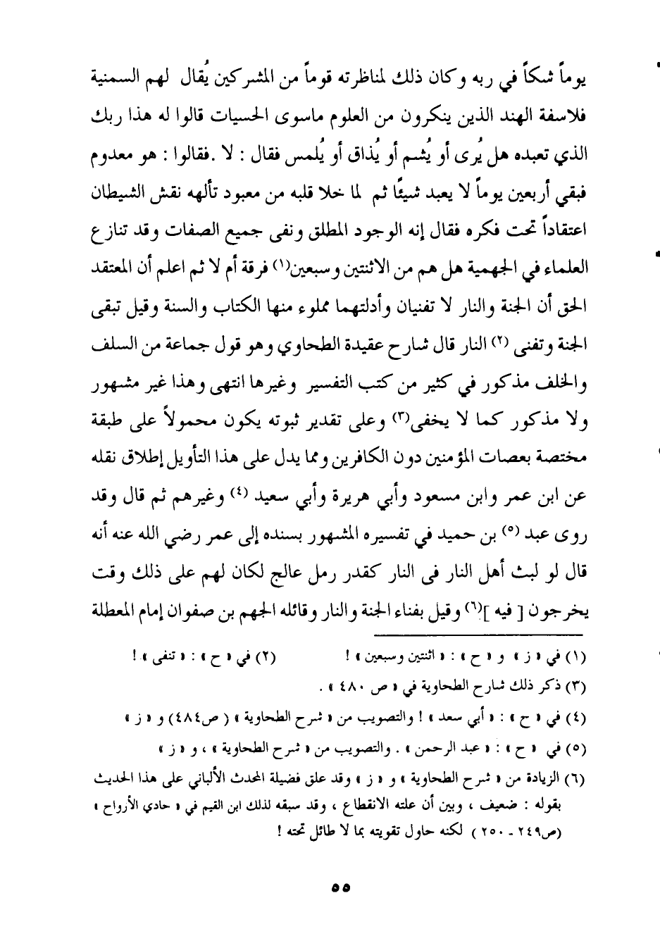 يَوْمًا شكا فِي ربه وَكَانَ ذَلِك لمناظرته قوما من الْمُشْركين يُقَال لَهُم السمنية فلاسفة الْهِنْد الَّذين يُنكرُونَ من الْعُلُوم مَا سوى الحسيات قَالُوا لَهُ هَذَا رَبك الَّذِي تعبده هَل يرى أَو يشم أَو يذاق أَو يلمس فَقَالَ لَا فَقَالُوا هُوَ مَعْدُوم فَبَقيَ أَرْبَعِينَ يَوْمًا لَا يعبد شَيْئا ثمَّ لما خلا قلبه من معبود تألهه نقش الشَّيْطَان اعتقادا تَحت فكره فَقَالَ إِنَّه الْوُجُود الْمُطلق وَنفى جَمِيع الصِّفَات وَقد تنَازع الْعلمَاء فِي الْجَهْمِية هَل هم من الاثنتين وَسبعين فرقة أم لَا ثمَّ اعْلَم أَن المعتقد الْحق أَن الْجنَّة وَالنَّار لَا تفنيان وأدلتهما مَمْلُوء مِنْهَا الْكتاب وَالسّنة وَقيل تبقى الْجنَّة وتفنى النَّار قَالَ شَارِح عقيدة الطَّحَاوِيّ وَهُوَ قَول جمَاعَة من السّلف وَالْخلف مَذْكُور فِي كثير من كتب التَّفْسِير وَغَيرهَا انْتهى وَهَذَا غير مَشْهُور وَلَا مَذْكُور كَمَا لَا يخفى وعَلى تَقْدِير ثُبُوته يكون مَحْمُولا على طبقَة مُخْتَصَّة بعصات الْمُؤمنِينَ دون الْكَافرين وَمِمَّا يدل على هَذَا التَّأْوِيل إِطْلَاق نَقله عَن ابْن عمر وَابْن مَسْعُود وَأبي هُرَيْرَة وَأبي سعيد وَغَيرهم ثمَّ قَالَ وَقد روى عبد بن حميد فِي تَفْسِيره الْمَشْهُور بِسَنَدِهِ إِلَى عمر رَضِي الله عَنهُ أَنه قَالَ لَو لبث أهل النَّار فِي النَّار كَقدْر رمل عالج لَكَانَ لَهُم على ذَلِك وَقت يخرجُون فِيهِ وَقيل بِفنَاء الْجنَّة وَالنَّار وقائله الجهم بن صَفْوَان إِمَام المعطلة