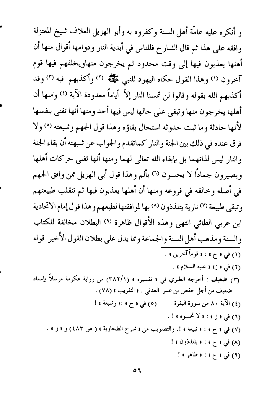 وَأنْكرهُ عَلَيْهِ عَامَّة أهل السّنة وكفروه بِهِ وَأَبُو الهزيل العلاف شيخ الْمُعْتَزلَة وَافقه على هَذَا ثمَّ قَالَ الشَّارِح فللناس فِي أبدية النَّار ودوامها أَقْوَال مِنْهَا أَن أَهلهَا يُعَذبُونَ فِيهَا إِلَى وَقت مَحْدُود ثمَّ يخرجُون مِنْهَا ويخلفهم فِيهَا قوم آخَرُونَ وَهَذَا القَوْل حَكَاهُ الْيَهُود للنَّبِي صلى الله عَلَيْهِ وَسلم وأكذبهم فِيهِ وَقد أكذبهم الله بقوله {وَقَالُوا لن تمسنا النَّار إِلَّا أَيَّامًا مَعْدُودَة} الْآيَة وَمِنْهَا أَن أَهلهَا يخرجُون مِنْهَا وَتبقى على حَالهَا لَيْسَ فِيهَا أحد وَمِنْهَا أَنَّهَا تفنى بِنَفسِهَا لِأَنَّهَا حَادِثَة وَمَا ثَبت حُدُوثه اسْتَحَالَ بَقَاؤُهُ وَهَذَا قَول الجهم وشيعته وَلَا فرق عِنْده فِي ذَلِك بَين الْجنَّة وَالنَّار كَمَا تقدم وَالْجَوَاب عَن شبهته أَن بَقَاء الْجنَّة وَالنَّار لَيْسَ لذاتهما بل بإبقاء الله تَعَالَى لَهما وَمِنْهَا أَنَّهَا تفنى حركات أَهلهَا ويصيرون جمادا لَا يحسون بألم وَهَذَا قَول أبي الهزيل مِمَّن وَافق الجهم فِي أَصله وَخَالفهُ فِي فروعه وَمِنْهَا أَن أَهلهَا يُعَذبُونَ فِيهِ ثمَّ تنْقَلب طبيعتهم وَتبقى طبيعة نارية يتلذذون بهَا لموافقتها لطبعهم وَهَذَا قَول إِمَام الاتحادية ابْن عَرَبِيّ الطَّائِي انْتهى وَهَذِه الْأَقْوَال ظَاهِرَة الْبطلَان مُخَالفَة للْكتاب وَالسّنة وَمذهب أهل السّنة وَالْجَمَاعَة وَمِمَّا يدل على بطلَان القَوْل الْأَخير قَوْله