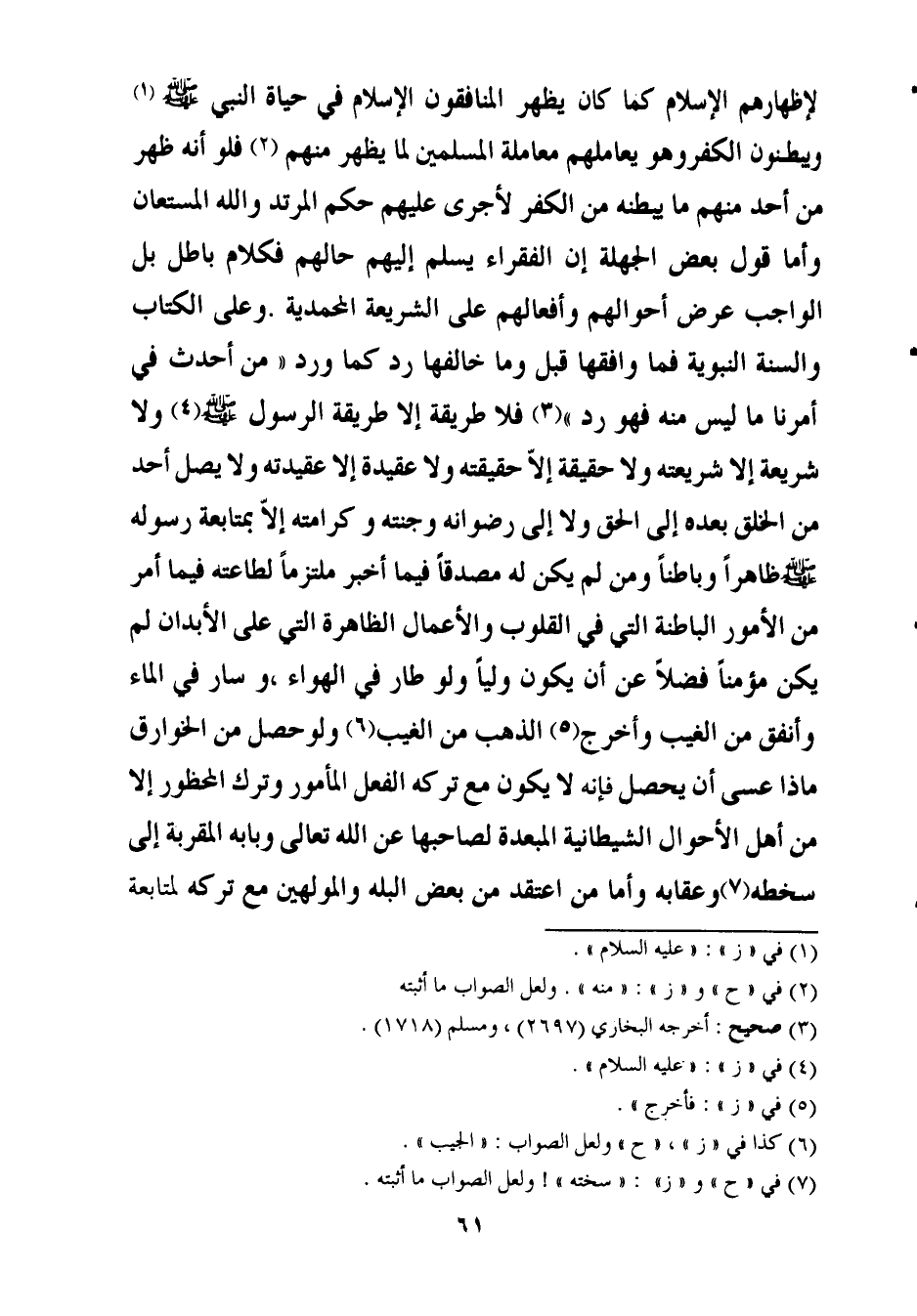 لإظهارهم الْإِسْلَام كَمَا كَانَ يظْهر المُنَافِقُونَ الْإِسْلَام فِي حَيَاة النَّبِي صلى الله عَلَيْهِ وَسلم ويبطنون الْكفْر وَهُوَ يعاملهم مُعَاملَة الْمُسلمين لما يظْهر مِنْهُم فَلَو أَنه ظهر من أحد مِنْهُم مَا يبطنه من الْكفْر لأجرى عَلَيْهِم حكم الْمُرْتَد وَالله الْمُسْتَعَان وَأما قَول بعض الجهلة إِن الْفُقَرَاء يسلم إِلَيْهِم حَالهم فَكَلَام بَاطِل بل الْوَاجِب عرض أَحْوَالهم وأفعالهم على الشَّرِيعَة المحمدية وعَلى الْكتاب وَالسّنة النَّبَوِيَّة فَمَا وافقها قبل وَمَا خالفها رد كَمَا ورد (من أحدث فِي أمرنَا مَا لَيْسَ مِنْهُ فَهُوَ رد) فَلَا طَريقَة إِلَّا طَريقَة الرَّسُول صلى الله عَلَيْهِ وَسلم وَلَا شَرِيعَة إِلَّا شَرِيعَته وَلَا حَقِيقَة إِلَّا حَقِيقَته وَلَا عقيدة إِلَّا عقيدته وَلَا يصل أحد من الْخلق بعده إِلَى الْحق وَلَا إِلَى رضوانه وجنته وكرامته إِلَّا بمتابعة رَسُوله صلى الله عَلَيْهِ وَسلم ظَاهرا وَبَاطنا وَمن لم يكن لَهُ مُصدقا فِيمَا أخبر مُلْتَزما لطاعته فِيمَا أَمر من الْأُمُور الْبَاطِنَة الَّتِي فِي الْقُلُوب والأعمال الظَّاهِرَة الَّتِي على الْأَبدَان لم يكن مُؤمنا فضلا عَن أَن يكون وليا وَلَو طَار فِي الْهَوَاء وَسَار فِي المَاء وَأنْفق من الْغَيْب وَأخرج الذَّهَب من الْغَيْب وَلَو حصل من الخوارق مَاذَا عَسى أَن يحصل فَإِنَّهُ لَا يكون مَعَ تَركه الْفِعْل الْمَأْمُور وَترك الْمَحْظُور إِلَّا من أهل الْأَحْوَال الشيطانية المبعدة لصَاحِبهَا عَن الله تَعَالَى وبابه المقربة إِلَى سخطه وعقابه وَأما من اعْتقد من بعض البله والمولهين مَعَ تَركه لمتابعة