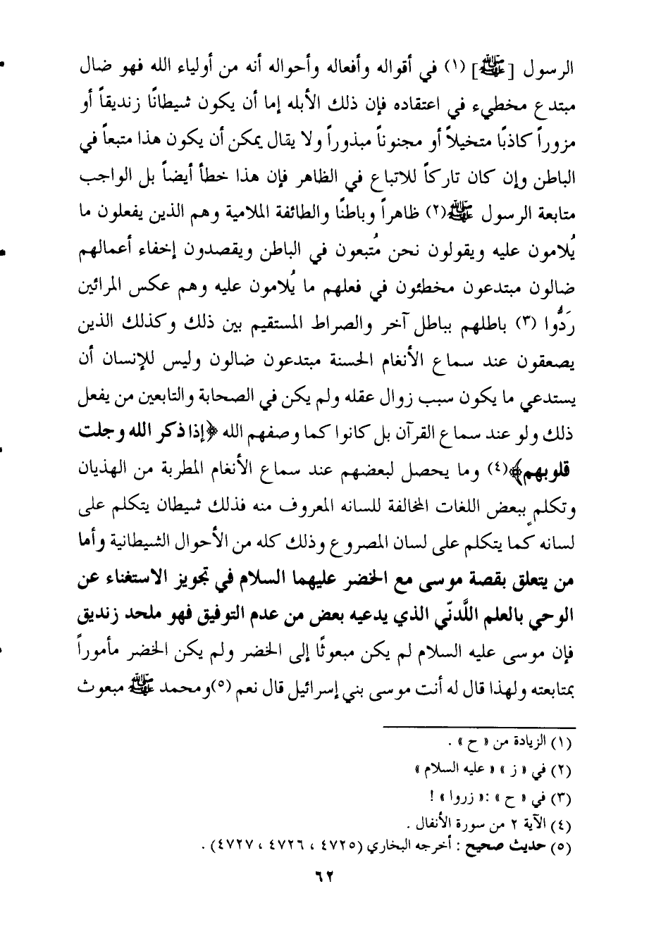الرَّسُول صلى الله عَلَيْهِ وَسلم فِي أَقْوَاله وأفعاله وأحواله أَنه من أَوْلِيَاء الله فَهُوَ ضال مُبْتَدع مُخطئ فِي اعْتِقَاده فَإِن ذَلِك الأبله إِمَّا أَن يكون شَيْطَانا زندقيا أَو مزورا كَاذِبًا متخيلا أَو مَجْنُونا مبذورا وَلَا يُقَال يُمكن أَن يكون هَذَا مُتبعا فِي الْبَاطِن وَإِن كَانَ تَارِكًا لِلِاتِّبَاعِ فِي الظَّاهِر فَإِن هَذَا خطأ أَيْضا بل الْوَاجِب مُتَابعَة الرَّسُول صلى الله عَلَيْهِ وَسلم ظَاهرا وَبَاطنا والطائفة الملامية وهم الَّذين يَفْعَلُونَ مَا يلامون عَلَيْهِ وَيَقُولُونَ نَحن متبعون فِي الْبَاطِن ويقصدون إخفاء أَعْمَالهم ضالون مبتدعون مخطئون فِي فعلهم مَا يلامون عَلَيْهِ وهم عكس المرائين ردوا باطلهم بباطل آخر والصراط الْمُسْتَقيم بَين ذَلِك وَكَذَلِكَ الَّذين يصعقون عِنْد سَماع الْأَنْغَام الْحَسَنَة مبتدعون ضالون وَلَيْسَ للْإنْسَان أَن يَسْتَدْعِي مَا يكون سَبَب زَوَال عقله وَلم يكن فِي الصَّحَابَة وَالتَّابِعِينَ من يفعل ذَلِك وَلَو عِنْد سَماع الْقُرْآن بل كَانُوا كَمَا وَصفهم الله {إِذا ذكر الله وجلت قُلُوبهم} وَمَا يحصل لبَعْضهِم عِنْد سَماع الْأَنْغَام المطربة من الهذيان وَتكلم بِبَعْض اللُّغَات الْمُخَالفَة لِلِسَانِهِ الْمَعْرُوف مِنْهُ فَذَلِك شَيْطَان يتَكَلَّم على لِسَانه كَمَا يتَكَلَّم على لِسَان المصروع وَذَلِكَ كُله من الْأَحْوَال الشيطانية وَأما من يتَعَلَّق بِقصَّة مُوسَى مَعَ الْخضر عَلَيْهِمَا السَّلَام فِي تَجْوِيز الِاسْتِغْنَاء عَن الْوَحْي بِالْعلمِ اللدني الَّذِي يَدعِيهِ بعض من عدم التَّوْفِيق فَهُوَ ملحد زنديق فَإِن مُوسَى عَلَيْهِ السَّلَام لم يكن مَبْعُوثًا إِلَى الْخضر وَلم يكن الْخضر مَأْمُورا بمتابعته وَلِهَذَا قَالَ لَهُ أَنْت مُوسَى بني إِسْرَائِيل قَالَ نعم وَمُحَمّد صلى الله عَلَيْهِ وَسلم مَبْعُوث