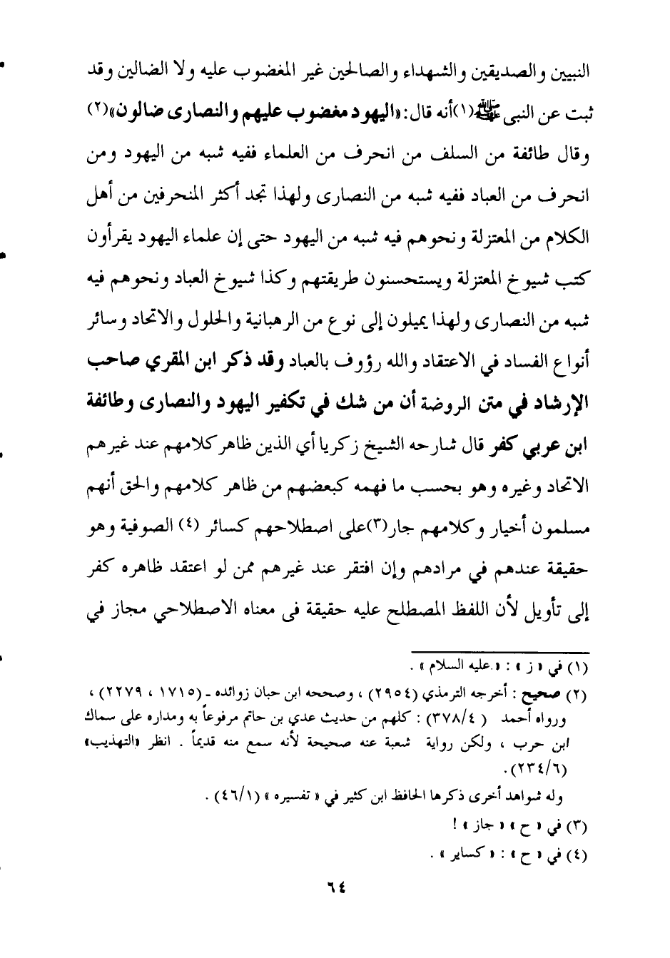 النَّبِيين وَالصديقين وَالشُّهَدَاء وَالصَّالِحِينَ غير المغضوب عَلَيْهِ وَلَا الضَّالّين وَقد ثَبت عَن النَّبِي صلى الله عَلَيْهِ وَسلم أَنه قَالَ (الْيَهُود مغضوب عَلَيْهِم وَالنَّصَارَى ضالون) وَقَالَ طَائِفَة من السّلف من انحرف من الْعلمَاء فَفِيهِ شبه من الْيَهُود وَمن انحرف من الْعباد فَفِيهِ شبه من النَّصَارَى وَلِهَذَا تَجِد أَكثر المنحرفين من أهل الْكَلَام من الْمُعْتَزلَة وَنَحْوهم فِيهِ شبه من الْيَهُود حَتَّى إِن عُلَمَاء الْيَهُود يقرأون كتب شُيُوخ الْمُعْتَزلَة ويستحسنون طريقتهم وَكَذَا شُيُوخ الْعباد وَنَحْوهم فِيهِ شبه من النَّصَارَى وَلِهَذَا يميلون إِلَى نوع من الرهبانية والحلول والاتحاد وَسَائِر أَنْوَاع الْفساد فِي الِاعْتِقَاد وَالله رؤوف بالعباد وَقد ذكر ابْن الْمقري صَاحب الْإِرْشَاد فِي متن الرَّوْضَة أَن من شكّ فِي تَكْفِير الْيَهُود وَالنَّصَارَى وَطَائِفَة ابْن عَرَبِيّ كفر قَالَ شَارِحه الشَّيْخ زَكَرِيَّا أَي الَّذين ظَاهر كَلَامهم عِنْد غَيرهم الِاتِّحَاد وَغَيره وَهُوَ بِحَسب مَا فهمه كبعضهم من ظَاهر كَلَامهم وَالْحق أَنهم مُسلمُونَ أخيار وَكَلَامهم جَار على اصطلاحهم كَسَائِر الصُّوفِيَّة وَهُوَ حَقِيقَة عِنْدهم فِي مُرَادهم وَإِن افْتقر عِنْد غَيرهم مِمَّن لَو اعْتقد ظَاهره كفر إِلَى تَأْوِيل لِأَن اللَّفْظ المصطلح عَلَيْهِ حَقِيقَة فِي مَعْنَاهُ الاصطلاحي مجَاز فِي
