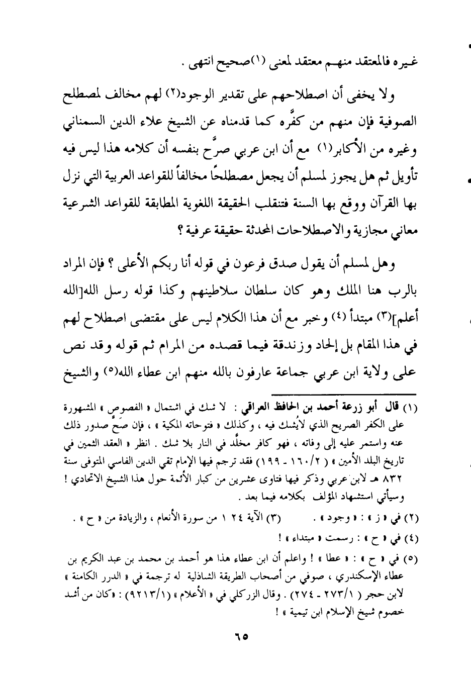 وَلَا يخفى أَن اصطلاحهم على تَقْدِير الْوُجُود لَهُم مُخَالف لمصطلح الصُّوفِيَّة فَإِن مِنْهُم من كفره كَمَا قدمْنَاهُ عَن الشَّيْخ عَلَاء الدّين السمناني وَغَيره من الأكابر مَعَ أَن ابْن عَرَبِيّ صرح بِنَفسِهِ أَن كَلَامه هَذَا لَيْسَ فِيهِ تَأْوِيل ثمَّ هَل يجوز لمُسلم أَن يَجْعَل مصطلحا مُخَالفا للقواعد الْعَرَبيَّة الَّتِي نزل بهَا الْقُرْآن وَوَقع بهَا السّنة فتنقلب الْحَقِيقَة اللُّغَوِيَّة الْمُطَابقَة للقواعد الشَّرْعِيَّة مَعَاني مجازية والاصطلاحات المحدثة حَقِيقَة عرفية هَل لمُسلم أَن يَقُول صدق فِرْعَوْن فِي قَوْله أَنا ربكُم الْأَعْلَى فَإِن المُرَاد بالرب هُنَا الْملك وَهُوَ كَانَ سُلْطَان سلاطينهم وَكَذَا قَوْله رسل الله الله أعلم مُبْتَدأ وَخبر مَعَ أَن هَذَا الْكَلَام لَيْسَ على مُقْتَضى اصْطِلَاح لَهُم فِي هَذَا الْمقَام بل إلحاد وزندقة فِيمَا قَصده من المرام ثمَّ قَوْله وَقد نَص على ولَايَة ابْن عَرَبِيّ جمَاعَة عارفون بِاللَّه مِنْهُم ابْن عَطاء الله وَالشَّيْخ