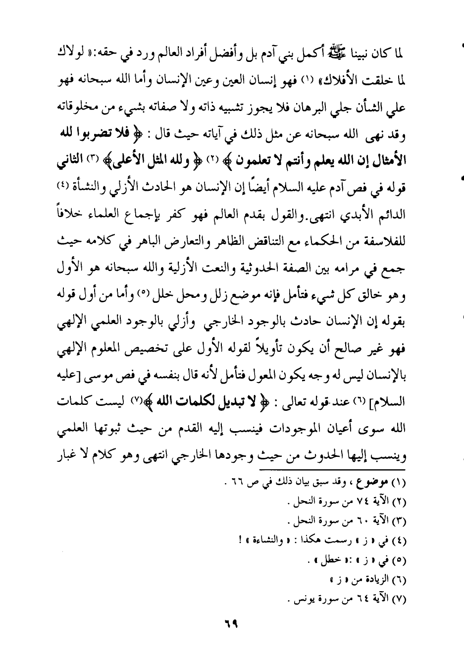 لما كَانَ نَبينَا صلى الله عَلَيْهِ وَسلم أكمل بني آدم بل وَأفضل أَفْرَاد الْعَالم ورد فِي حَقه (لولاك لما خلقت الأفلاك) فَهُوَ إِنْسَان الْعين وَعين الْإِنْسَان وَأما الله سُبْحَانَهُ فَهُوَ عَليّ الشَّأْن جلي الْبُرْهَان فَلَا يجوز تَشْبِيه ذَاته وَلَا صِفَاته بِشَيْء من مخلوقاته وَقد نهى الله سُبْحَانَهُ عَن مثل ذَلِك فِي آيَاته حَيْثُ قَالَ {فَلَا تضربوا لله الْأَمْثَال إِن الله يعلم وَأَنْتُم لَا تعلمُونَ} {وَللَّه الْمثل الْأَعْلَى} الثَّانِي قَوْله فِي فص آدم عَلَيْهِ السَّلَام أَيْضا إِن الْإِنْسَان هُوَ الْحَادِث الأزلي والنشأة الدَّائِم الأبدي انْتهى وَالْقَوْل بقدم الْعَالم فَهُوَ كفر بِإِجْمَاع الْعلمَاء خلافًا للفلاسفة من الْحُكَمَاء مَعَ التَّنَاقُض الظَّاهِر والتعارض الباهر فِي كَلَامه حَيْثُ جمع فِي مرامه بَين الصّفة الحدوثية والنعت الأزلية وَالله سُبْحَانَهُ هُوَ الأول وَهُوَ خَالق كل شَيْء فَتَأمل فَإِنَّهُ مَوضِع زلل وَمحل خلل وَأما من أول قَوْله بقوله إِن الْإِنْسَان حَادث بالوجود الْخَارِجِي وأزلي بالوجود العلمي الإلهي فَهُوَ غير صَالح أَن يكون تَأْوِيلا لقَوْله الأول على تَخْصِيص الْمَعْلُوم الإلهي بالإنسان لَيْسَ لَهُ وَجه يكون الْمعول فَتَأمل لِأَنَّهُ قَالَ بِنَفسِهِ فِي فص مُوسَى عَلَيْهِ السَّلَام عِنْد قَوْله تَعَالَى {لَا تَبْدِيل لكلمات الله} لَيست كَلِمَات الله سوى أَعْيَان الموجودات فينسب إِلَيْهِ الْقدَم من حَيْثُ ثُبُوتهَا العلمي وينسب إِلَيْهَا الْحُدُوث من حَيْثُ وجودهَا الْخَارِجِي انْتهى وَهُوَ كَلَام لَا غُبَار