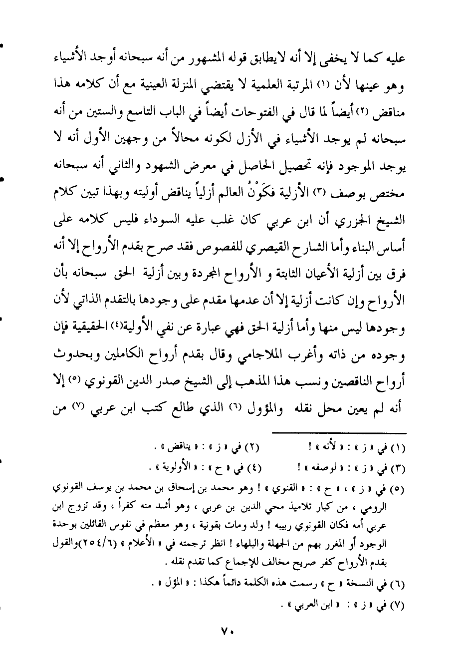 عَلَيْهِ كَمَا لَا يخفى إِلَّا أَنه لَا يُطَابق قَوْله الْمَشْهُور من أَنه سُبْحَانَهُ أوجد الْأَشْيَاء وَهُوَ عينهَا لِأَن الْمرتبَة العلمية لَا يَقْتَضِي الْمنزلَة العينية مَعَ أَن كَلَامه هَذَا مُنَاقض أَيْضا لما قَالَ فِي الفتوحات أَيْضا فِي الْبَاب التَّاسِع وَالسِّتِّينَ من أَنه سُبْحَانَهُ لم يُوجد الْأَشْيَاء فِي الْأَزَل لكَونه محالا من وَجْهَيْن الأول أَنه لَا يُوجد الْمَوْجُود فَإِنَّهُ تَحْصِيل الْحَاصِل فِي معرض الشُّهُود وَالثَّانِي أَنه سُبْحَانَهُ مُخْتَصّ بِوَصْف الأزلية فكون الْعَالم أزليا يُنَاقض أوليته وَبِهَذَا تبين كَلَام الشَّيْخ الْجَزرِي أَن ابْن عَرَبِيّ كَانَ غلب عَلَيْهِ السَّوْدَاء فَلَيْسَ كَلَامه على أساس الْبناء وَأما الشَّارِح القيصري للفصوص فقد صرح بقدم الْأَرْوَاح إِلَّا أَنه فرق بَين أزلية الْأَعْيَان الثَّابِتَة والأرواح الْمُجَرَّدَة وَبَين أزلية الْحق سُبْحَانَهُ بِأَن الْأَرْوَاح وَإِن كَانَت أزلية إِلَّا أَن عدمهَا مقدم على وجودهَا بالتقدم الذاتي لِأَن وجودهَا لَيْسَ مِنْهَا وَأما أزلية الْحق فَهِيَ عبارَة عَن نفي الأولية الْحَقِيقِيَّة فَإِن وجوده من ذَاته وَأغْرب الملاجامي وَقَالَ بقدم أَرْوَاح الكاملين وبحدوث أَرْوَاح الناقصين وَنسب هَذَا الْمَذْهَب إِلَى الشَّيْخ صدر الدّين القونوي إِلَّا أَنه لم يعين مَحل نَقله والمؤول الَّذِي طالع كتب ابْن عَرَبِيّ من