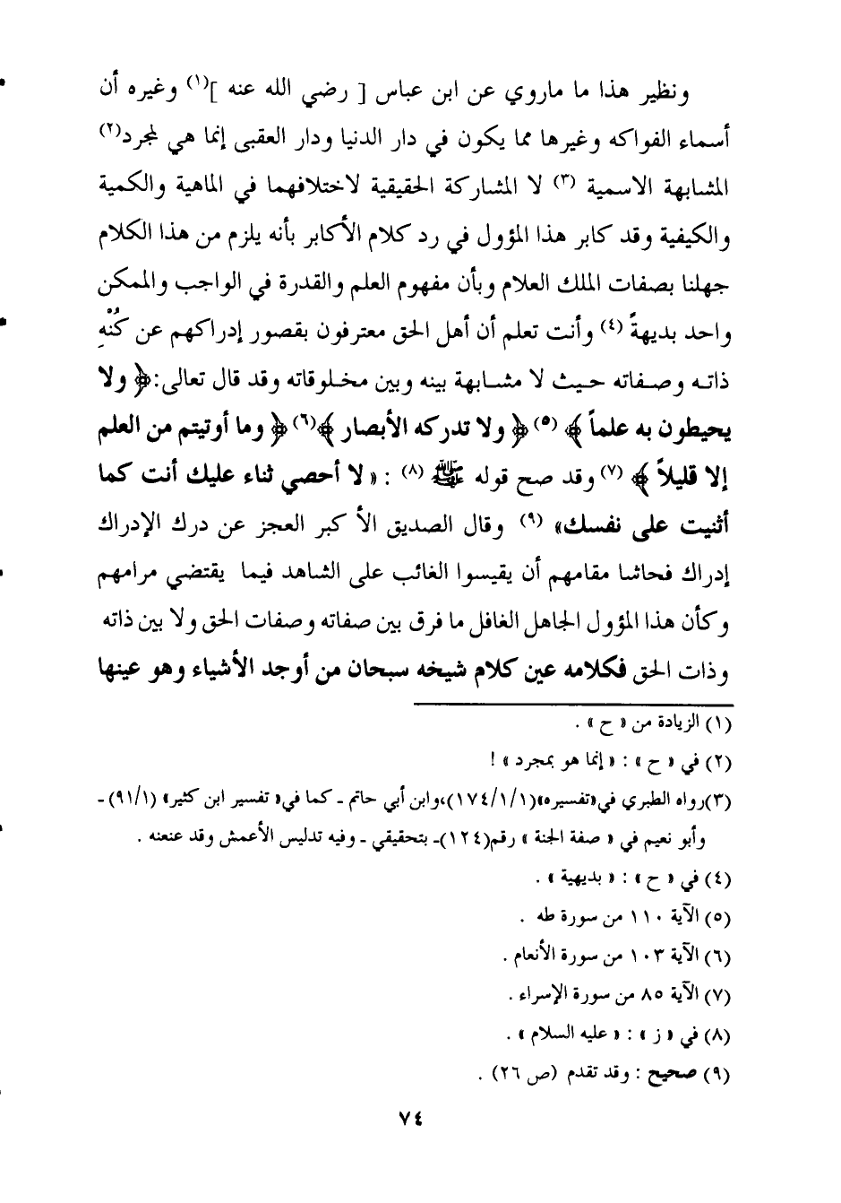 وَنَظِير هَذَا ماروي عَن ابْن عَبَّاس رَضِي الله عَنهُ وَغَيره أَن أَسمَاء الْفَوَاكِه وَغَيرهَا مِمَّا يكون فِي دَار الدُّنْيَا وَدَار العقبى إِنَّمَا هِيَ لمُجَرّد المشابهة الاسمية لَا الْمُشَاركَة الْحَقِيقِيَّة لاختلافهما فِي الْمَاهِيّة والكمية والكيفية وَقد كَابر هَذَا المؤول فِي رد كَلَام الأكابر بِأَنَّهُ يلْزم من هَذَا الْكَلَام جهلنا بِصِفَات الْملك الْعَالم وَبِأَن مَفْهُوم الْعلم وَالْقُدْرَة فِي الْوَاجِب والممكن وَاحِد بديهة وَأَنت تعلم أَن أهل الْحق معترفون بقصور إدراكهم عَن كنه ذَاته وَصِفَاته حَيْثُ لَا مشابهة بَينه وَبَين مخلوقاته وَقد قَالَ تَعَالَى {وَلَا يحيطون بِهِ علما} و {لَا تُدْرِكهُ الْأَبْصَار} {وَمَا أُوتِيتُمْ من الْعلم إِلَّا قَلِيلا} وَقد صَحَّ قَوْله صلى الله عَلَيْهِ وَسلم (لَا أحصي ثَنَاء عَلَيْك أَنْت كَمَا أثنيت على نَفسك) وَقَالَ الصّديق الْأَكْبَر الْعَجز عَن دَرك الْإِدْرَاك إِدْرَاك فحاشا مقامهم أَن يقيسوا الْغَائِب على الشَّاهِد فِيمَا يَقْتَضِي مرامهم وَكَأن هَذَا المؤول الْجَاهِل الغافل مَا فرق بَين صِفَاته وصفات الْحق وَلَا بَين ذَاته وَذَات الْحق فَكَلَامه عين كَلَام شَيْخه سُبْحَانَ من أوجد الْأَشْيَاء وَهُوَ عينهَا