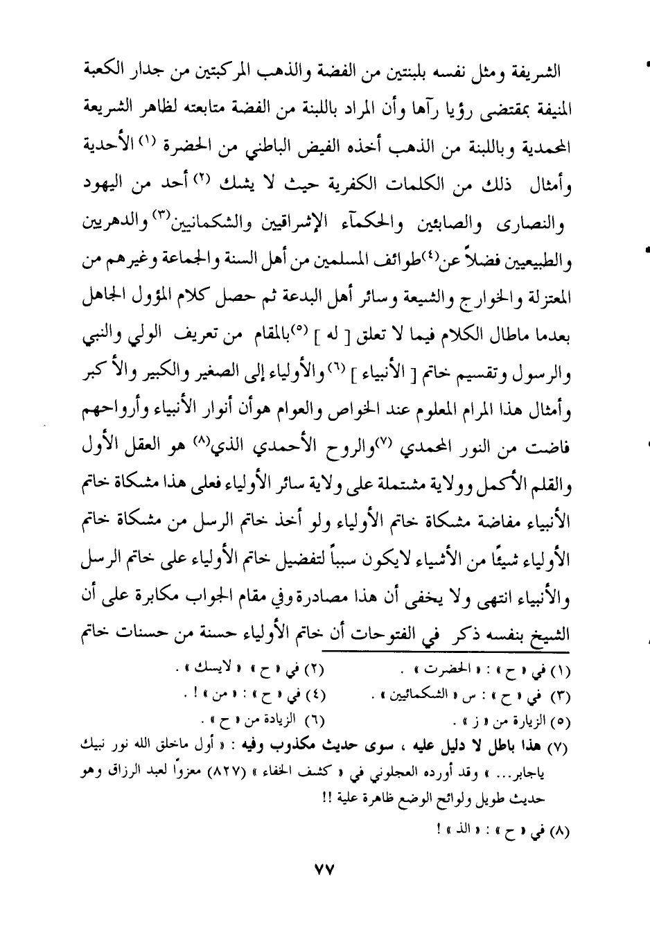 الشَّرِيفَة وَمثل نَفسه بلبنتين من الْفضة وَالذَّهَب المركبتين من جِدَار الْكَعْبَة المنيفة بِمُقْتَضى رُؤْيا رَآهَا وَأَن المُرَاد باللبنة من الْفضة مُتَابَعَته لظَاهِر الشَّرِيعَة المحمدية وباللبنة من الذَّهَب أَخذه الْفَيْض الباطني من الحضرة الأحدية وأمثال ذَلِك من الْكَلِمَات الكفرية حَيْثُ لَا يشك أحد من الْيَهُود وَالنَّصَارَى وَالصَّابِئِينَ والحكمآء الإشراقيين والشكمانيين والدهريين والطبيعيين فضلا عَن طوائف الْمُسلمين من أهل السّنة وَالْجَمَاعَة وَغَيرهم من الْمُعْتَزلَة والخوارج والشيعة وَسَائِر أهل الْبِدْعَة ثمَّ حصل كَلَام المؤول الْجَاهِل بَعْدَمَا ماطال الْكَلَام فِيمَا لَا تعلق لَهُ بالْمقَام من تَعْرِيف الْوَلِيّ وَالنَّبِيّ وَالرَّسُول وتقسيم خَاتم الْأَنْبِيَاء والأولياء إِلَى الصَّغِير وَالْكَبِير والأكبر وأمثال هَذَا المرام الْمَعْلُوم عِنْد الْخَواص والعوام هُوَ أَن أنوار الْأَنْبِيَاء وأرواحهم فاضت من النُّور المحمدي وَالروح الأحمدي الَّذِي هُوَ الْعقل الأول والقلم الْأَكْمَل وَولَايَة مُشْتَمِلَة على ولَايَة سَائِر الْأَوْلِيَاء فعلى هَذَا مشكاة خَاتم الْأَنْبِيَاء مفاضة مشكاة خَاتم الْأَوْلِيَاء وَلَو أَخذ خَاتم الرُّسُل من مشكاة خَاتم الْأَوْلِيَاء شَيْئا من الْأَشْيَاء لَا يكون سَببا لتفضيل خَاتم الْأَوْلِيَاء على خَاتم الرُّسُل والأنبياء انْتهى وَلَا يخفى أَن هَذَا مصادرة وَفِي مقَام الْجَواب مُكَابَرَة على أَن الشَّيْخ بِنَفسِهِ ذكر فِي الفتوحات أَن خَاتم الْأَوْلِيَاء حَسَنَة من حَسَنَات خَاتم