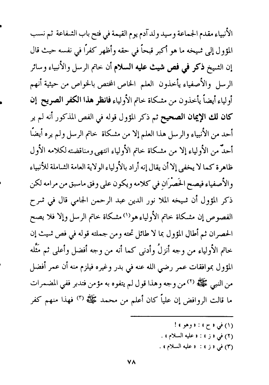 الْأَنْبِيَاء مقدم الْجَمَاعَة وَسيد ولد آدم يَوْم الْقِيَامَة فِي فتح بَاب الشَّفَاعَة ثمَّ نسب المؤول إِلَى شَيْخه مَا هُوَ أكبر قبحا فِي حَقه وَأظْهر كفرا فِي نَفسه حَيْثُ قَالَ إِن الشَّيْخ ذكر فِي فص شِيث عَلَيْهِ السَّلَام أَن خَاتم الرُّسُل والأنبياء وَسَائِر الرُّسُل والأصفياء يَأْخُذُونَ الْعلم الْخَاص الْمُخْتَص بالخواص من حيثية أَنهم أَوْلِيَاء أَيْضا يَأْخُذُونَ من مشكاة خَاتم الْأَوْلِيَاء فَانْظُر هَذَا الْكفْر الصَّرِيح إِن كَانَ لَك الْإِيمَان الصَّحِيح ثمَّ ذكر المؤول قَوْله فِي الفص الْمَذْكُور أَنه لم ير أحد من الْأَنْبِيَاء وَالرسل هَذَا الْعلم إِلَّا من مشكاة خَاتم الرُّسُل وَلم يره أَيْضا أحد من الْأَوْلِيَاء إِلَّا من مشكاة خَاتم الْأَوْلِيَاء انْتهى ومناقضته لكَلَامه الأول ظَاهِرَة كَمَا لَا يخفى إِلَّا أَن يُقَال إِنَّه أَرَادَ بالأولياء الْولَايَة الْعَامَّة الشاملة للأنبياء والأصفياء فَيصح الحصران فِي كَلَامه وَيكون على وفْق مَا سبق من مرامه لَكِن ذكر المؤول أَن شَيْخه الملا نور الدّين عبد الرَّحْمَن الجامي قَالَ فِي شرح الفصوص إِن مشكاة خَاتم الْأَوْلِيَاء هُوَ مشكاة خَاتم الرُّسُل وَإِلَّا فَلَا يَصح الحصران ثمَّ أَطَالَ المؤول بِمَا لَا طائل تَحْتَهُ وَمن جملَته قَوْله فِي فص شِيث إِن خَاتم الْأَوْلِيَاء من وَجه أنزل وَأدنى كَمَا أَنه من وَجه أفضل وَأَعْلَى ثمَّ مثله المؤول بموافقات عمر رَضِي الله عَنهُ فِي بدر وَغَيره فَيلْزم مِنْهُ أَن عمر أفضل من النَّبِي صلى الله عَلَيْهِ وَسلم من وَجه وَهَذَا قَول لم يتفوه بِهِ مُؤمن فَتدبر فَفِي الْمُضْمرَات مَا قَالَت الروافض إِن عليا كَانَ أعلم من مُحَمَّد صلى الله عَلَيْهِ وَسلم فَهَذَا مِنْهُم كفر