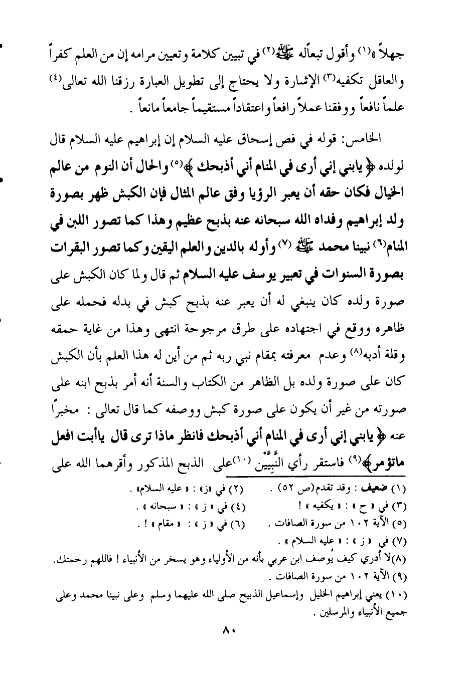 الْخَامِس قَوْله فِي فص إِسْحَاق عَلَيْهِ السَّلَام إِن إِبْرَاهِيم عَلَيْهِ السَّلَام قَالَ لوَلَده {يَا بني إِنِّي أرى فِي الْمَنَام أَنِّي أذبحك} وَالْحَال أَن النّوم من عَالم الخيال فَكَانَ حَقه أَن يعبر الرُّؤْيَا وفْق عَالم الْمِثَال فَإِن الْكَبْش ظهر بِصُورَة ولد إِبْرَاهِيم وفداه الله سُبْحَانَهُ عَنهُ بِذبح عَظِيم وَهَذَا كَمَا تصور اللَّبن فِي الْمَنَام نَبينَا مُحَمَّد صلى الله عَلَيْهِ وَسلم وأوله بِالدّينِ وَالْعلم وَالْيَقِين وكما تصور الْبَقَرَات بِصُورَة السنوات فِي تَعْبِير يُوسُف عَلَيْهِ السَّلَام ثمَّ قَالَ وَلما كَانَ الْكَبْش على صُورَة وَلَده كَانَ يَنْبَغِي لَهُ أَن يعبر عَنهُ بِذبح كَبْش فِي بدله فَحَمله على ظَاهره وَوَقع فِي اجْتِهَاده على طرق مرجوحة انْتهى وَهَذَا من غَايَة حمقه وَقلة أدبه وَعدم مَعْرفَته بمقام نَبِي ربه ثمَّ من أَيْن لَهُ هَذَا الْعلم بِأَن الْكَبْش كَانَ على صُورَة وَلَده بل الظَّاهِر من الْكتاب وَالسّنة أَنه أَمر بِذبح ابْنه على صورته من غير أَن يكون على صُورَة كَبْش وَوَصفه كَمَا قَالَ تَعَالَى مخبرا عَنهُ {يَا بني إِنِّي أرى فِي الْمَنَام أَنِّي أذبحك فَانْظُر مَاذَا ترى قَالَ يَا أَبَت افْعَل مَا تُؤمر} فاستقر رَأْي النَّبِيين على الذّبْح الْمَذْكُور وأقرهما الله على