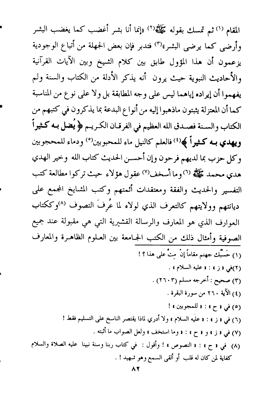 الْمقَام ثمَّ تسمك بقوله صلى الله عَلَيْهِ وَسلم (إِنَّمَا أَنا بشر أغضب كَمَا يغْضب الْبشر وأرضى كَمَا يرضى الْبشر) فَتدبر فَإِن بعض الجهلة من أَتبَاع الوجودية يَزْعمُونَ أَن هَذَا المؤول طابق بَين كَلَام الشَّيْخ وَبَين الْآيَات القرآنية وَالْأَحَادِيث النَّبَوِيَّة حَيْثُ يرَوْنَ أَنه يذكر الْأَدِلَّة من الْكتاب وَالسّنة وَلم يفهموا أَن إِيرَاده إيَّاهُمَا لَيْسَ على وَجه الْمُطَابقَة بل وَلَا على نوع من الْمُنَاسبَة كَمَا أَن الْمُعْتَزلَة يثبتون مَا ذَهَبُوا إِلَيْهِ من أَنْوَاع الْبِدْعَة بِمَا يذكرُونَ فِي كتبهمْ من الْكتاب وَالسّنة فَصدق الله الْعَظِيم فِي الْفرْقَان الْكَرِيم {يضل بِهِ كثيرا وَيهْدِي بِهِ كثيرا} فالعلم كالنيل من مَاء للمحبوبين وَدِمَاء للمحجوبين وكل حزب بِمَا لديهم فَرِحُونَ وَإِن أحسن الحَدِيث كتاب الله وَخير الْهدى هدي مُحَمَّد صلى الله عَلَيْهِ وَسلم وَمَا أسخف عقول هَؤُلَاءِ حَيْثُ تركُوا مطالعة كتب التَّفْسِير والْحَدِيث وَالْفِقْه ومعتقدات أئمتهم وَكتب الْمَشَايِخ الْمجمع على ديانتهم وولايتهم كالتعرف الَّذِي لولاه لما عرف التصوف وككتاب العوارف الَّذِي هُوَ المعارف والرسالة القشيرية الَّتِي هِيَ مَقْبُولَة عِنْد جَمِيع الصُّوفِيَّة وأمثال ذَلِك من الْكتب الجامعة بَين الْعُلُوم الظَّاهِرَة والمعارف