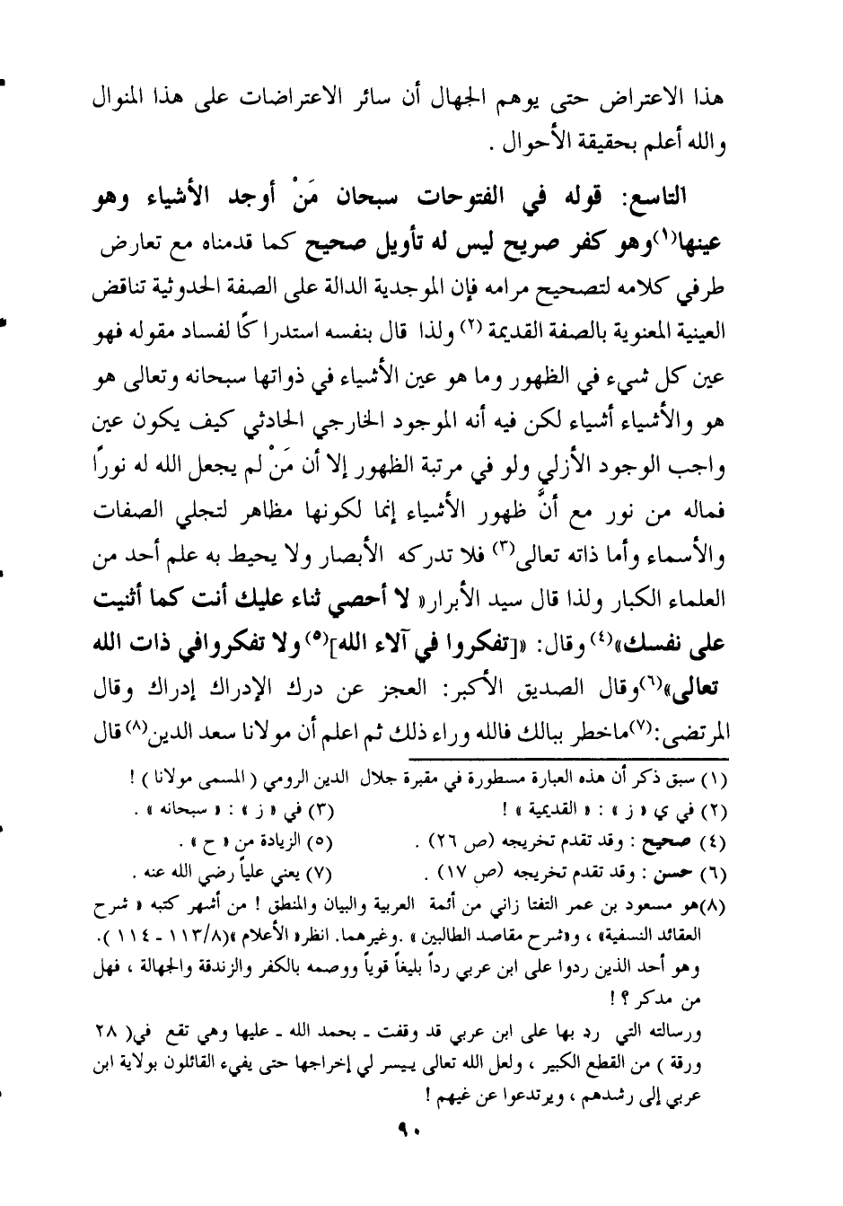 التَّاسِع قَوْله فِي الفتوحات سُبْحَانَ من أوجد الْأَشْيَاء وَهُوَ عينهَا وَهُوَ كفر صَرِيح لَيْسَ لَهُ تَأْوِيل صَحِيح كَمَا قدمْنَاهُ مَعَ تعَارض طرفِي كَلَامه لتصحيح مرامه فَإِن الموجدية الدَّالَّة على الصّفة الحدوثية تنَاقض العينية المعنوية بِالصّفةِ الْقَدِيمَة وَلذَا قَالَ بِنَفسِهِ استدراكا لفساد مقوله فَهُوَ عين كل شَيْء فِي الظُّهُور وَمَا هُوَ عين الْأَشْيَاء فِي ذواتها سُبْحَانَهُ وَتَعَالَى هُوَ هُوَ والأشياء أَشْيَاء لَكِن فِيهِ أَنه الْمَوْجُود الْخَارِجِي الحادثي كَيفَ يكون عين وَاجِب الْوُجُود الأزلي وَلَو فِي مرتبَة الظُّهُور إِلَّا أَن من لم يَجْعَل الله لَهُ نورا فَمَاله من نور مَعَ أَن ظُهُور الْأَشْيَاء إِنَّمَا لكَونهَا مظَاهر لتجلي الصِّفَات والأسماء وَأما ذَاته تَعَالَى فَلَا تُدْرِكهُ الْأَبْصَار وَلَا يُحِيط بِهِ علم أحد من الْعلمَاء الْكِبَار وَلذَا قَالَ سيد الْأَبْرَار (لَا أحصي ثَنَاء عَلَيْك أَنْت كَمَا أثنيت على نَفسك) وَقَالَ (تَفَكَّرُوا فِي آلَاء الله وَلَا تَفَكَّرُوا فِي ذَات الله تَعَالَى) وَقَالَ الصّديق الْأَكْبَر الْعَجز عَن دَرك الْإِدْرَاك إِدْرَاك وَقَالَ المرتضى مَا خطر ببالك فَالله وَرَاء ذَلِك ثمَّ اعْلَم أَن مَوْلَانَا سعد الدّين قَالَ