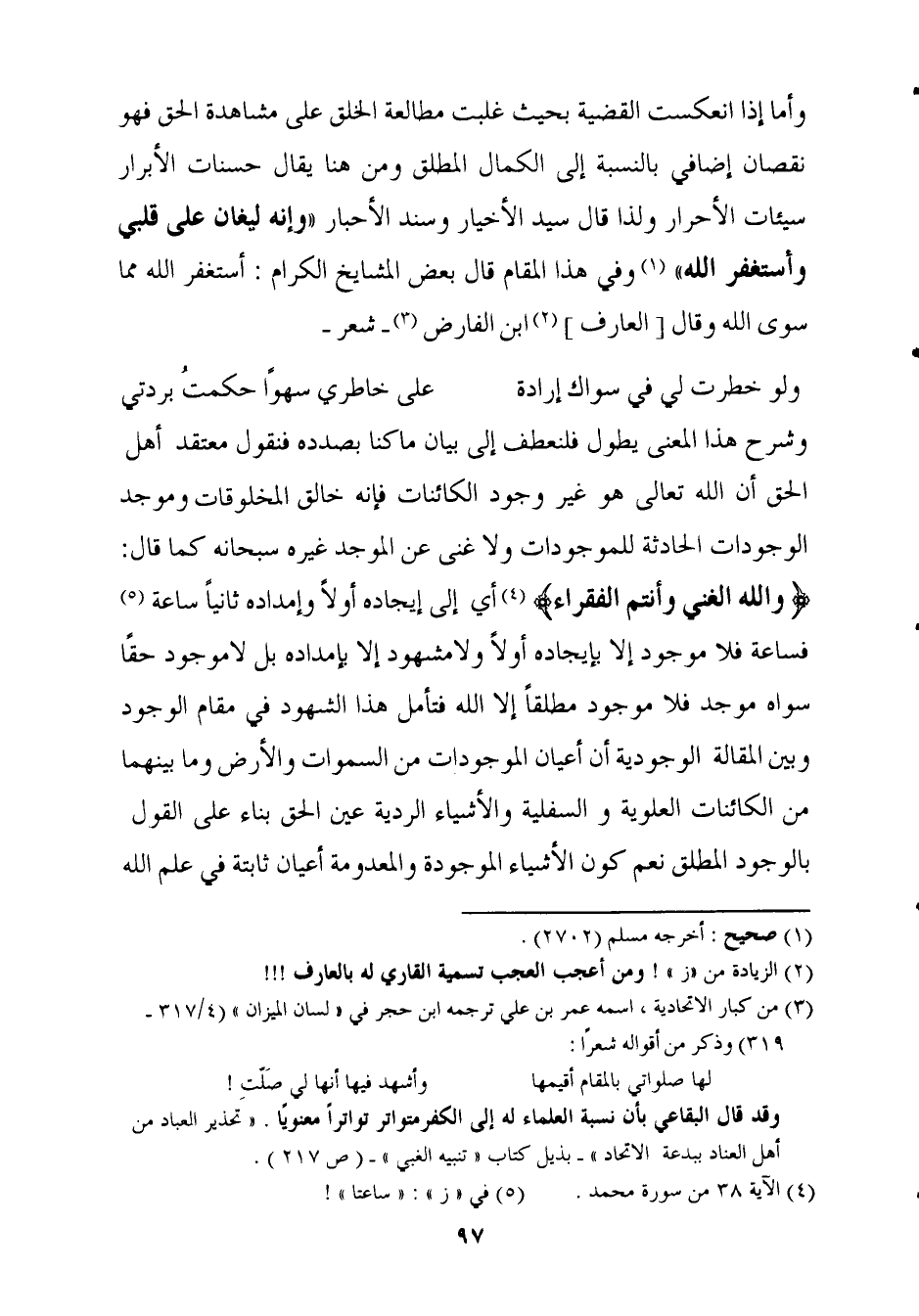 وَشرح هَذَا الْمَعْنى يطول فلنعطف إِلَى بَيَان مَا كُنَّا بصدده فَنَقُول مُعْتَقد أهل الْحق أَن الله تَعَالَى هُوَ غير وجود الكائنات فَإِنَّهُ خَالق الْمَخْلُوقَات وموجد الوجودات الْحَادِثَة للموجودات وَلَا غنى عَن الموجد غَيره سُبْحَانَهُ كَمَا قَالَ {وَالله الْغَنِيّ وَأَنْتُم الْفُقَرَاء} أَي إِلَى إيجاده أَولا وإمداده ثَانِيًا سَاعَة فساعة فَلَا مَوْجُود إِلَّا بإيجاده أَولا وَلَا مشهود إِلَّا بإمداده بل لَا مَوْجُود حَقًا سواهُ موجد فَلَا مَوْجُود مُطلقًا إِلَّا الله فَتَأمل هَذَا الشُّهُود فِي مقَام الْوُجُود وَبَين الْمقَالة الوجودية أَن أَعْيَان الموجودات من السَّمَوَات وَالْأَرْض وَمَا بَينهمَا من الكائنات العلوية والسفلية والأشياء الردية عين الْحق بِنَاء على القَوْل بالوجود الْمُطلق نعم كَون الْأَشْيَاء الْمَوْجُودَة والمعدومة أَعْيَان ثَابِتَة فِي علم الله