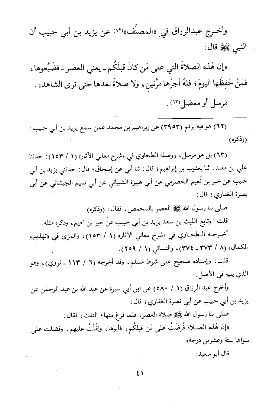 وأخرج عبد الرزاق فى مصنفه عن يزيد بن أبى حبيب أن النبي - صلى الله عليه وسلم - قال: (إن هذه الصلاة التى فرضت على من كان قبلكم - يعنى العصر - فضيعوها فمن حفظها اليوم فله أجرها مرتين، ولا صلاة بعدها حتى يرى الشاهد) .
