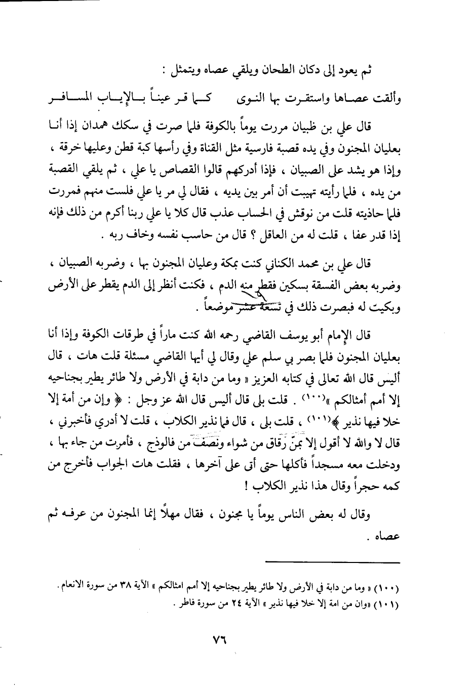 قال الإمام أبو يوسف القاضي رحمه الله كنت ماراً في طرقات الكوفة وإذا أنا بعليان المجنون فلما بصر بي سلم علي وقال لي أيها القاضي مسئلة قلت هات، قال أليس قال الله تعالى في كتابه العزيز " وما من دابة في الأرض ولا طائر يطير بجناحيه إلا أمم أمثالكم ". قلت بلى قال أليس قال الله عز وجل: " وإن من أمة إلا خلا فيها نذير "، قلت بلى، قال فما نذير الكلاب، قلت لا أدري فأخبرني، قال لا والله لا أقول إلا بمن رقاق من شواء ونصف من فالوذج، فأمرت من جاء بها، ودخلت معه مسجداً فأكلها حتى أتى على آخرها، فقلت هات الجواب فأخرج من كمه حجراً وقال هذا نذير الكلاب! وقال له بعض الناس يوماً يا مجنون، فقال مهلاً إنما المجنون من عرفه ثم عصاه.
