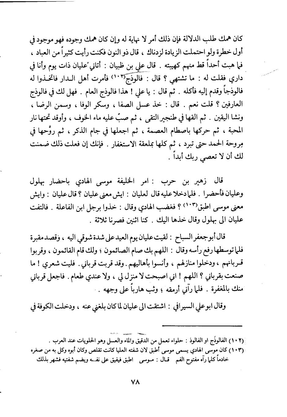كان همك طلب الدلالة فإن ذلك أمر لا نهاية له وإن كان همك وجوده فهو موجود في أول خطرة ولو احتملت الزيادة لزدناك، قال ذو النون فكنت رأيت كثيراً من العباد، فما هبت أحداً قط منهم كهيبته. قال علي بن ظبيان: أتاني عليان ذات يوم وأنا في داري فقلت له: ما تشتهي؟ قال: فالوذج فأمرت أهل الدار فاتخذوا له فالوذجاً وقدم إليه فأكله. ثم قال: يا علي! هذا فالوذج العام. فهل لك في فالوذج العارفين؟ قلت نعم. قال: خذ عسل الصفا، وسكر الوفا، وسمن الرضا، ونشا اليقين. ثم القها في طنجير التقى، ثم صب عليه ماء الخوف، وأوقد تحتها نار المحبة، ثم حركها باصطام العصمة، ثم اجعلها في جام الذكر، ثم روحها في مروحة الحمد حتى تبرد، ثم كلها بملعقة الاستغفار. فإنك إن فعلت ذلك ضمنت لك أن لا تعصي ربك أبداً.