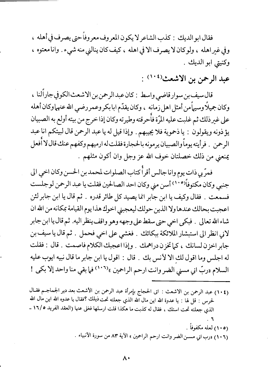 فمر بي ذات يوم وأنا جالس أقرأ كتاب الصلوات لمحمد بن الحسن وكان أخي إلى جنبي وكان مكتوفاً أسن مني وكان أحد الصالحين فقلت يا عبد الرحمن لو جلست فسمعت. فقال وكيف يا ابن جابر إنما يصيد كل طائر قدره. ثم قال يا ابن جابر لئن أعجبت بحالك عندها ولا الذين حولك ليعجبني أخوك هذا يوم القيامة بمكانه من الله إن شاء الله تعالى. فبكى أخي حتى سقط على وجهه وهو واقف ينظر إليه. ثم قال يا ابن جابر لأني أنظر إلى استبشار الملائكة ببكائك. فغشي على أخي فحمل. ثم قال يا سيف بن جابر اخزن لسانك، كما تخزن دراهمك. وإذا أعجبك الكلام فاصمت. قال: فقلت له اجلس وما أقول لك إلا لآنس بك. قال: أقول يا ابن جابر ما قال نبيه أيوب عليه السلام رب إني مسني الضر وأنت أرحم الراحمين فما بقي منا واحد إلا بكى!