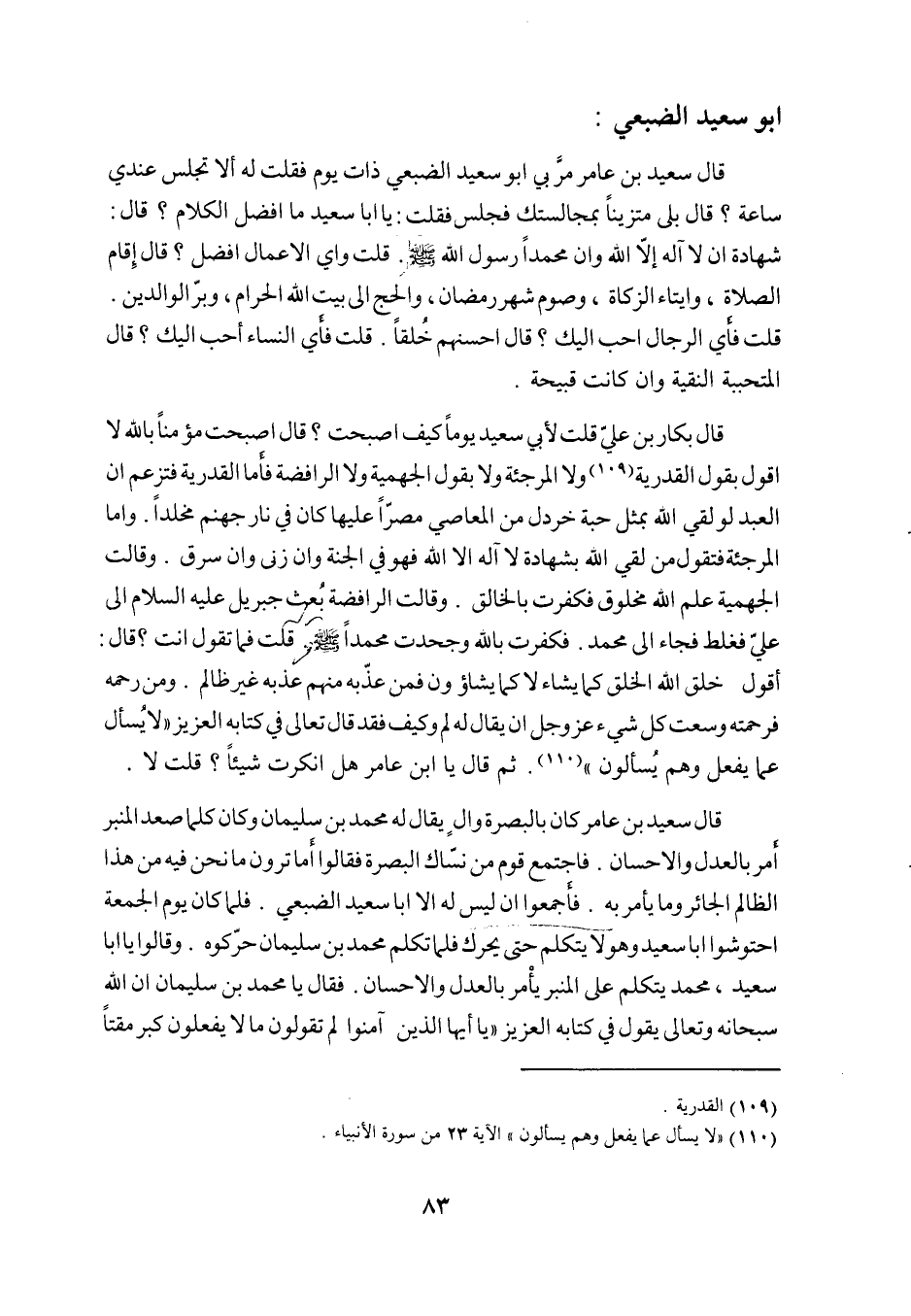 قال بكار بن علي قلت لأبي سعيد يوماً كيف أصبحت؟ قال أصبحت مؤمناً بالله لا أقول بقول القدرية ولا المرجئة ولا بقول الجهمية ولا الرافضة فأما القدرية فتزعم أن العبد لو لقي الله بمثل حبة خردل من المعاصي مصراً عليها كان في نار جهنم مخلداً. وأما المرجئة فتقول من لقي الله بشهادة لا إله إلا الله فهو في الجنة وإن زنى وإن سرق. وقالت الجهمية علم الله مخلوق فكفرت بالخالق. وقالت الرافضة بعث جبريل عليه السلام إلى علي فغلط فجاء إلى محمد. فكفرت بالله وجحدت محمداً صلى الله عليه وسلم. قلت فما تقول أنت؟ قال: أقول خلق الله الخلق كما يشاء لا كما يشاؤون فمن عذبه منهم عذبه غير ظالم. ومن رحمه فرحمته وسعت كل شيء عز وجل أن يقال له لم وكيف فقد قال تعالى في كتابه العزيز " لا يُسأل عما يفعل وهم يُسالون ". ثم قال يا ابن عامر هل أنكرت شيئاً؟ قلت لا.