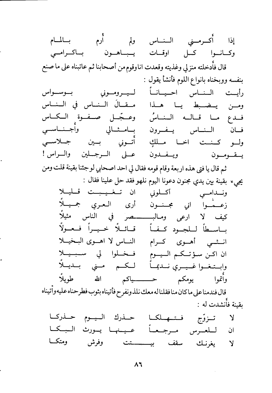 ثم قال يا فتى هذه أربعة وقام قومه فقال لي أحد أصحابي لو جئنا بقينة قلت ومن يجيء بقينة بين يدي مجنون دعونا اليوم نلهو فقد حل علينا فقال: