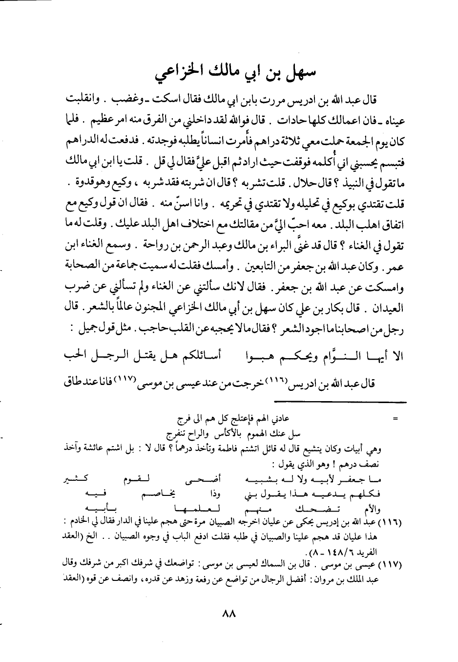 قال عبد الله بن ادريس مررت بابن أبي مالك فقال اسكت وغضب. وانقلبت عيناه فإن أعمالك كلها حادات. قال فوالله لقد داخلني من الفرق منه أمر عظيم. فلما كان يوم الجمعة حملت معي ثلاثة دراهم فأمرت انساناً يطلبه فوجدته. فدفعت له الدراهم فتبسم يحسبني إني أُكلمه فوقفت حيث أراد ثم أقبل علي فقال لي قل. قلت يا ابن أبي مالك ما تقول في النبيذ؟ قال حلال. قلت تشربه؟ قال إن شربته فقد شربه، وكيع وهو قدوة. قلت تقتدي بوكيع في تحليله ولا تقتدي في تحريمه. وأنا أسن منه. فقال إن قول وكيع مع اتفاق أهلب البلد. معه أحب إلي من مقالتك مع اختلاف أهل البلد عليك. وقلت له ما تقول في الغناء؟ قال قد غنى البراء بن مالك وعبد الرحمن بن رواحة. وسمع الغناء ابن عمر. وكان عبد الله بن جعفر من التابعين. وأمسك فقلت له سميت جماعة من الصحابة وأمسكت عن عبد الله بن جعفر. فقال لأنك سألتني عن الغناء ولم تسألني عن ضرب العيدان. قال بكار بن علي كان سهل بن أبي مالك الخزاعي المجنون عالماً بالشعر. قال رجل من أصحابنا ما أجود الشعر؟ فقال ما لا يحجبه عن القلب حاجب. مثل قول جميل: