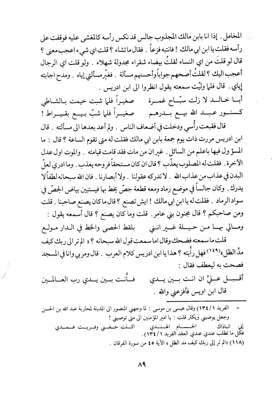قال فقبعت رأسي ودخلت في أضعاف الناس. ولم أعد بعدها إلى مسألته. قال ابن ادريس مررت ذات يوم جمعة بابن أبي مالك فقلت له متى تقوم الساعة؟ قال: ما المسؤول فيها باعلم من السائل. غير إن من مات فقد قامت قيامته. والموت أول عدل الآخرة. فقلت له المصلوب يعذب؟ قال إن كان مستحقاً فروحه يعذب. وما أدري لعل البدن في عذاب من عذاب الله. لا تدركه عقولنا. ولا أبصارنا. فإن الله سبحانه لطفاً لا يدرك. وكان جالساً في موضع رماد ومعه قطعة جص يخط بها فيستبين بياض الجص في سواد الرماد. فقلت له يا ابن أبي مالك! ايش تصنع؟ قال ما كان يصنع صاحبنا. قلت ومن صاحبكم؟ قال مجنون بني عامر. قلت وما كان يصنع؟ قال أسمعه يقول: