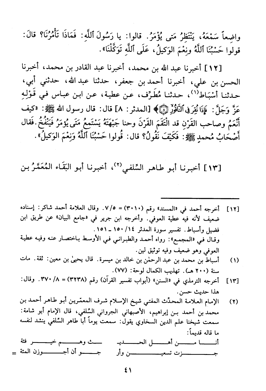 12 - أخبرنا عبد الله بن محمد أخبرنا عبد القادر بن محمد أخبرنا الحسن بن علي أخبرنا أحمد بن جعفر حدثنا عبد الله حدثني أبي حدثنا أسباط حدثنا مطرف عن عطية عن ابن عباس في قوله عز وجل: {فإذا نقر في الناقور}. قال قال رسول الله صلى الله عليه وسلم كيف أنعم وصاحب القرن قد التقم القرن وحنا جبهته يستمع متى يؤمر فينفخ فقال أصحاب محمد صلى الله عليه وسلم فكيف نقول قال قولوا حسبنا الله ونعم الوكيل.