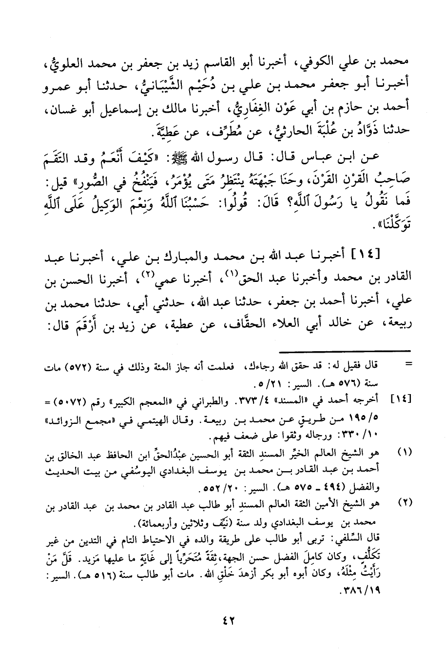 14 - أخبرنا عبد الله بن محمد والمبارك بن علي أخبرنا عبد القادر محمد وأخبرنا عبد الحق أخبرنا عمي أخبرنا الحسن بن علي أخبرنا أحمد بن جعفر حدثنا عبد الله حدثني أبي حدثنا محمد بن ربيعة عن خالد أبي العلاء الحقاف عن عطية عن زيد بن أرقم قال -[43]- قال رسول الله صلى الله عليه وسلم كيف أنعم وصاحب القرن قد التقم القرن وحنا جبهته أصغى السمع متى يؤمر فسمع ذلك أصحاب رسول الله صلى الله عليه وسلم فشق عليهم فقال رسول الله صلى الله عليه وسلم قولوا حسبنا الله ونعم الوكيل.