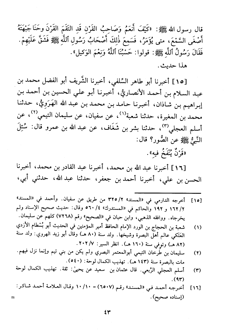 16 - أخبرنا عبد الله بن محمد أخبرنا عبد القادر بن محمد أخبرنا الحسن بن علي أخبرنا أحمد بن جعفر حدثنا عبد الله حدثني أبي -[44]- حدثنا إسماعيل حدثنا سليمان التيمي عن أسلم العجلي عن بشر بن شغاف عن عبد الله بن عمرو قال قال أعرابي يا رسول الله ما الصور قال قرن ينفخ فيه.