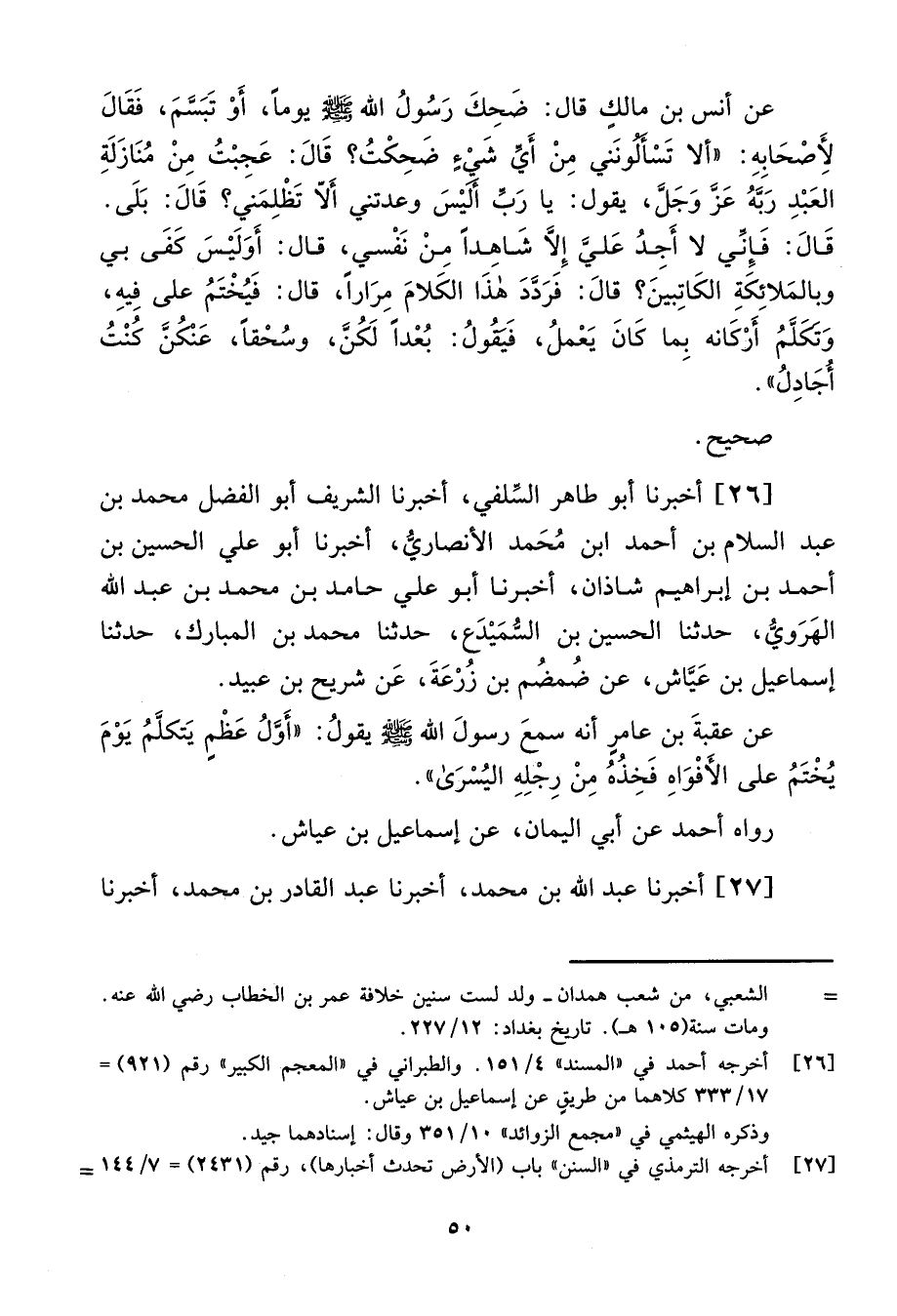 26 - أخبرنا أبو طاهر السلفي أخبرنا الشريف أبو الفضل محمد بن عبد السلام بن أحمد بن محمد الأنصاري أخبرنا أبو علي الحسين بن أحمد بن إبراهيم شاذان أخبرنا أبو علي حامد بن محمد بن عبد الله الهروي حدثنا الحسين بن السميدع حدثنا محمد بن المبارك حدثنا إسماعيل بن عياش عن ضمضم بن زرعة عن شريح بن عبيد عن عقبة بن عامر أنه سمع رسول الله صلى الله عليه وسلم يقول أول عظم يتكلم يوم يختم على الأفواه فخذه من رجله اليسرى.