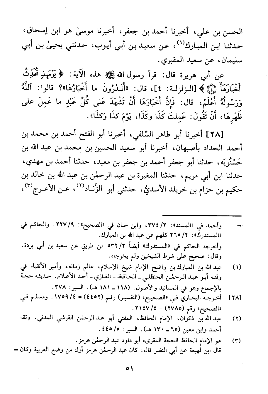 28 - أخبرنا أبو طاهر السلفي أخبرنا أبو الفتح أحمد بن محمد بن أحمد الحداد بأصبهان أخبرنا أبو سعيد الحسين بن محمد بن عبد الله بن حسنويه حدثنا أبو جعفر أحمد بن جعفر بن معبد حدثنا أحمد بن مهدي حدثنا ابن أبي مريم حدثنا المغيرة بن عبد الرحمن بن عبد الله بن خالد بن حكيم بن حزام بن خويلد الأسدي حدثني أبو الزناد عن الأعرج -[52]- عن أبي هريرة عن رسول الله صلى الله عليه وسلم قال ليأتي الرجل العظيم السمين يوم القيامة فلا يزن جناح بعوضة اقرؤوا: {فلا نقيم لهم يوم القيامة وزنا}.