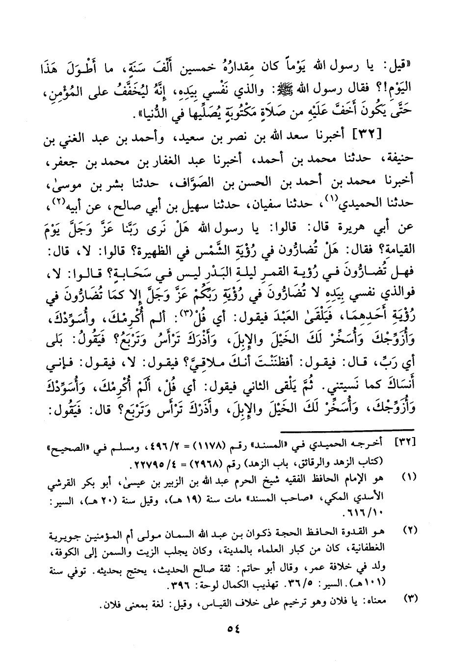 32 - أخبرنا سعد الله بن نصر بن سعيد وأحمد بن عبد الغني بن حنيفة حدثنا محمد بن أحمد أخبرنا عبد الغفار بن محمد بن جعفر أخبرنا محمد بن أحمد بن الحسن بن الصواف حدثنا بشر بن موسى حدثنا الحميدي حدثنا سفيان حدثنا سهيل بن أبي صالح عن أبيه عن أبي هريرة قال قالوا يا رسول الله هل نرى ربنا عز وجل يوم القيامة فقال هل تضارون في رؤية الشمس في الظهيرة قالوا لا قال فهل تضارون في رؤية القمر ليلة البدر ليس في سحابة قالوا لا فوالذي نفسي بيده لا تضارون في رؤية ربكم عز وجل إلا كما تضارون في رؤية أحدهما قال فيلقى العبد فيقول أي فل ألم أكرمك وأسودك وأزوجك وأسخر لك الخيل والإبل وأذرك ترأس وتربع فيقول بلى أي رب قال فيقول أفظننت أنك ملاقي فيقول لا فيقول فإني أنساك كما نسيتني ثم يلقى الثاني فيقول أي فل ألم أكرمك وأسودك وأزوجك وأسخر لك الخيل والإبل وأذرك ترأس وتربع قال فيقول -[55]- بلى أي رب قال فيقول أفظننت أنك ملاقي فيقول لا فيقول فإني أنساك كما نسيتني ثم يلقى الثالث فيقول آمنت بك وبكتابك وبرسولك وصليت وصمت وتصدقت ويثني بخير ما استطاع قال فيقول فها هنا إذا قال ثم قال ألا نبعث شاهدنا عليك فيفكر في نفسه من ذا الذي يشهد عليه فيختم على فيه ويقال لفخذه انطقي فتنطق فخذه ولحمه وعظامه بعمله ما كان وذلك ليعذر من نفسه وذلك المنافق وذلك الذي يسخط الله عز وجل عليه ثم ينادي مناد ألا اتبعت كل أمة ما كانت تعبد من دون الله فتتبع الشياطين والصلب أولياءهم إلى جهنم قال وبقينا أيها المؤمنون قال وبقينا أيها المؤمنون قال وبقينا أيها المؤمنون فيأتينا ربنا وهو ربنا وهو يثيبنا فيقول علام هؤلاء فنقول نحن عباد الله المؤمنون آمنا بالله لا نشرك بالله شيئا وهذا مقامنا حتى يأتينا ربنا وهو ربنا وهو يثيبنا ثم ينطلق حتى نأتي الجسر وعليها كلاليب من نار تخطف الناس فعند ذلك حلت الشفاعة أي اللهم سلم أي اللهم سلم فإذا جوزوا الجسر فكل من أنفق زوجا مما ملكت يمينه من المال في سبيل الله فكل خزنة الجنة يدعوه يا عبد الله يا مسلم هذا خير فتعال فقال أبو بكر يا رسول الله لا توا عليه يدع بابا ويلج من آخر قال فضربه النبي الله صلى الله عليه وسلم بيده إني لأرجو أن تكون منهم.