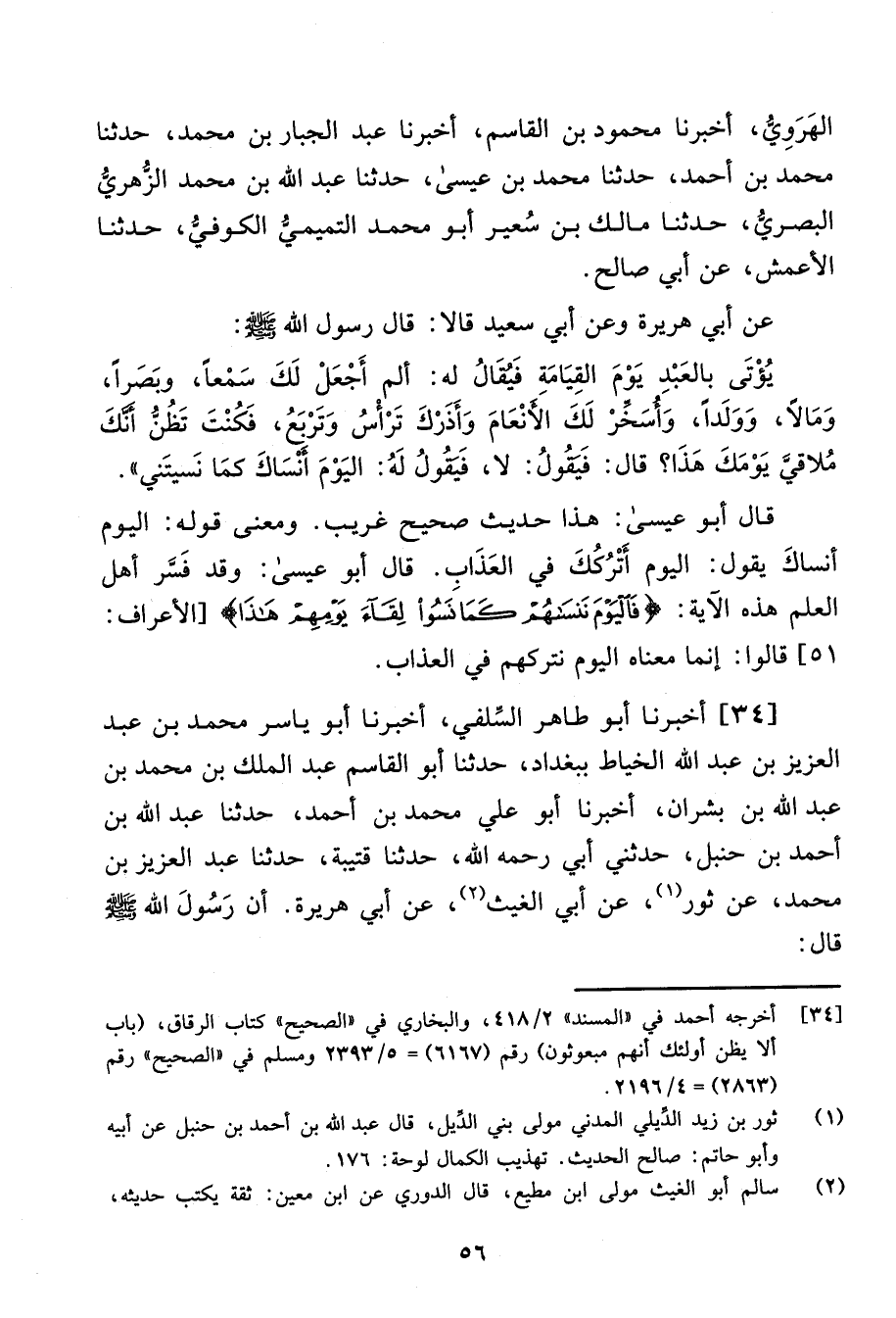 34 - أخبرنا أبو طاهر السلفي أخبرنا أبو ياسر محمد بن عبد العزيز بن عبد الله الخياط ببغداد حدثنا أبو القاسم عبد الملك بن محمد بن عبد الله بن بشران أخبرنا أبو علي محمد بن أحمد حدثنا عبد الله بن أحمد بن حنبل حدثني أبي رحمه الله حدثنا قتيبة حدثنا عبد العزيز بن محمد عن ثور عن أبي الغيث عن أبي هريرة أن رسول الله صلى الله عليه وسلم قال