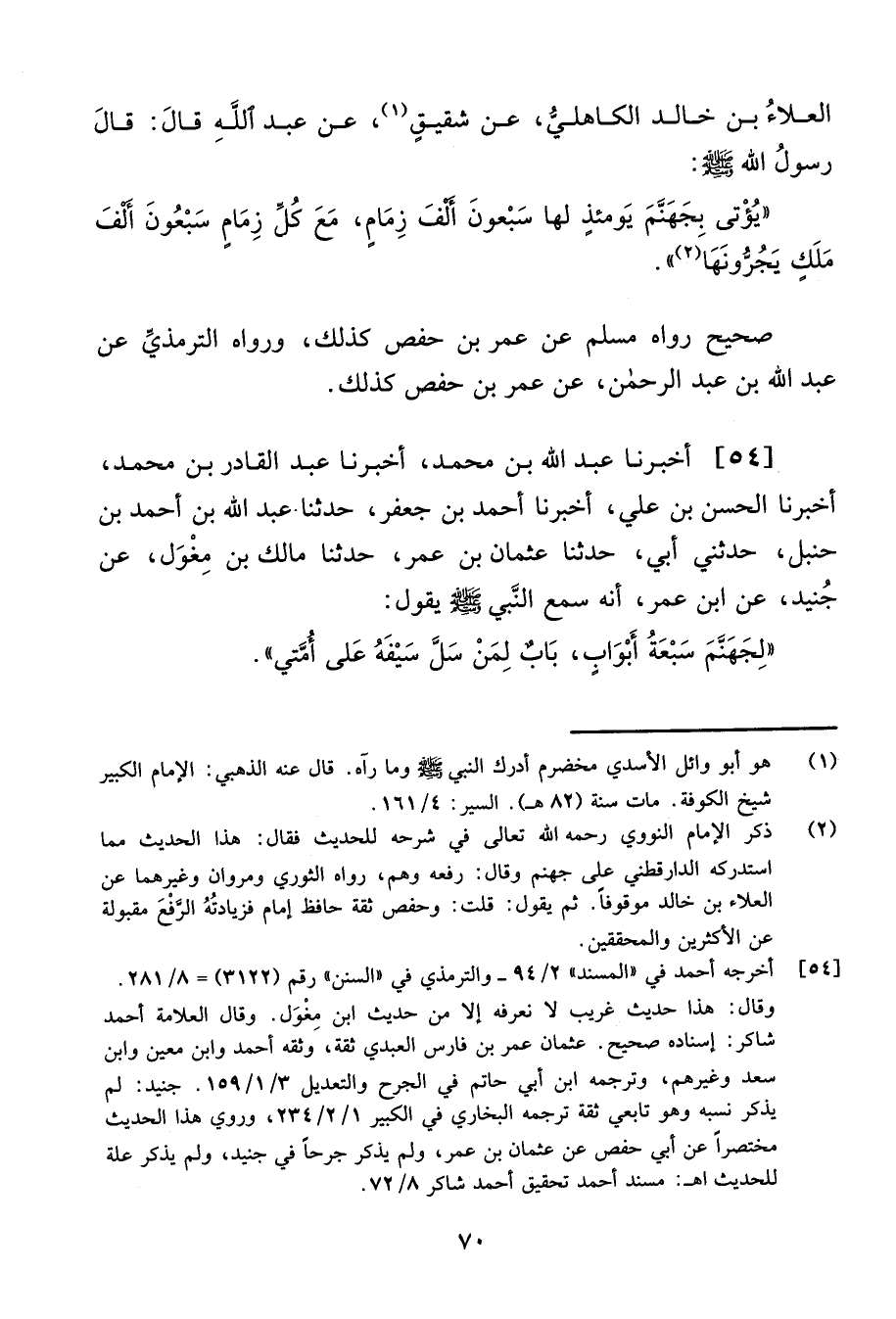 54 - أخبرنا عبد الله بن محمد أخبرنا عبد القادر بن محمد أخبرنا الحسن بن علي أخبرنا أحمد بن جعفر حدثنا عبد الله بن أحمد بن حنبل حدثني أبي حدثنا عثمان بن عمر حدثنا مالك بن مغول عن جنيد عن ابن عمر أنه سمع النبي صلى الله عليه وسلم يقول