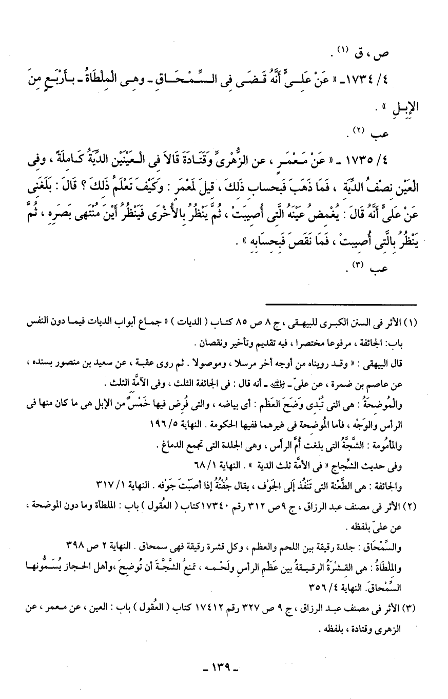 4/ 1735 - "عَنْ مَعْمَرٍ، عن الزُّهْرىِّ وَقَتَادَةَ قَالَا فِى الْعَيْنَيْن الدِّيَةُ كَامِلَةً، وفِى الْعَيْنِ نِصْفُ الدِّيَةِ، فَمَا ذَهَبَ فَبحسابِ ذَلِكَ، قِيلَ لمَعْمَرٍ: وَكَيْفَ تَعْلَمُ ذَلِكَ؟ قَالَ: بَلَغَنِى عَنْ عَليٍّ أَنَّهُ قَالَ: يُغْمِضُ عَيْنَهُ الَّتِى أُصِيبَتْ، ثُمَّ يَنْظُرُ بِالأُخْرَى فَيَنْظُرُ أَيْنَ مُنْتَهى بَصَرِهِ، ثُمَّ يَنْظُرُ بِالَّتِى أُصِيبتْ، فَمَا نَقَصَ فَبِحِسَابِهِ".