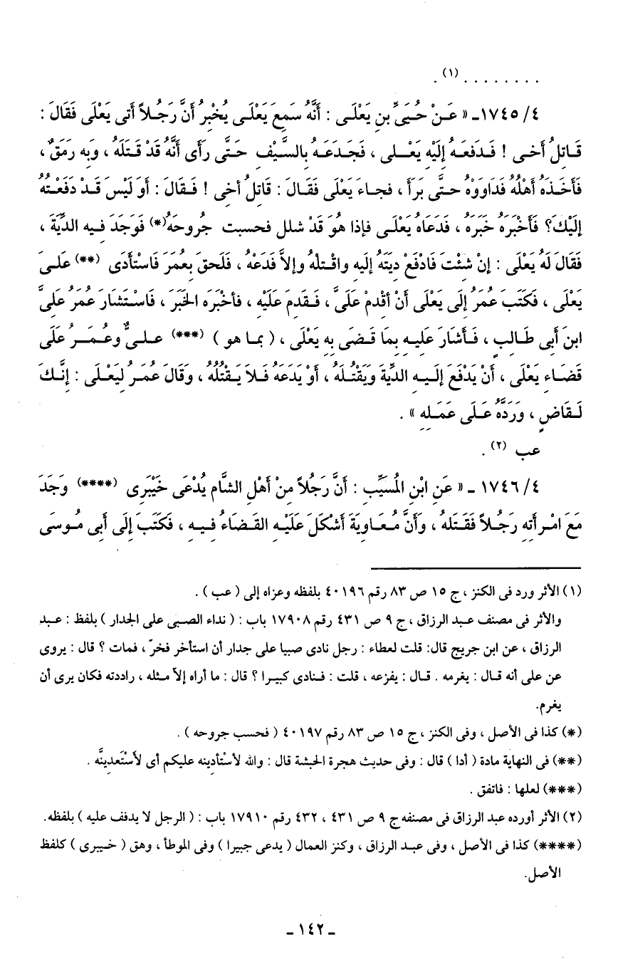 4/ 1745 - "عَنْ حُيَىَّ بنِ يَعْلَى: أَنَّهُ سَمِعَ يَعْلَى يُخْبِرُ أَنَّ رَجُلًا أَتى يَعْلَى فَقَالَ: قَاتِلُ أَخى! فَدَفعَهُ إِلَيْهِ يَعْلى، فَجَدَعَهُ بِالسَّيْفِ حَتَّى رَأَى أَنَّهُ قَدْ قَتَلَهُ، وَبِه رَمَقٌ، فَأَخَذَهُ أَهْلُهُ فَدَاوَوْهُ حتَّى بَرَأَ، فجاءَ يَعْلَى فَقَالَ: قَاتِلُ أخِى! فَقَالَ: أَوَلَيْسَ قَدْ دَفَعْتُهُ إلَيْكَ؟ فَأَخْبَرَهُ خَبَرَهُ، فَدَعَاهُ يَعْلَى فإذا هُوَ قَدْ شلل فحسبت جُروحَهُ (*) فَوَجَدَ فِيه الدِّيَةَ، فَقَالَ لَهُ يَعْلَى: إنْ شِئْتَ فَادْفَعْ دِيَتَهُ إلَيهِ واقْتلْهُ وإلَّا فَدَعْهُ، فَلَحقَ بِعُمَرَ فَاسْتأَدَى (* *) عَلىَ يَعْلَى، فَكَتَبَ عُمَرُ إِلَى يَعْلَى انْ أقدمْ عَلَىَّ، فَقَدِمَ عَلَيْهِ، فأخْبَرَه الخَبَرَ، فَاسْتَشَارَ عُمَرُ عَلِىَّ بنَ أَبِى طَالِبٍ، فَأَشَارَ عَلِيهِ بِمَا قَضَى بِهِ يَعْلَى، (بما هو) (* * *) علىٌّ وعُمَرُ عَلَى قَضَاءِ يَعْلَى، أَنْ يَدْفَعَ إلَيهِ الدِّيةَ وَيَقْتُلَهُ، أَوْ يَدَعَهُ فَلَا يَقْتُلُهُ، وَقَالَ عُمَرُ لِيَعْلَى: إِنَّكَ لَقَاضٍ، وَرَدَّهُ عَلَى عَمَلِهِ".