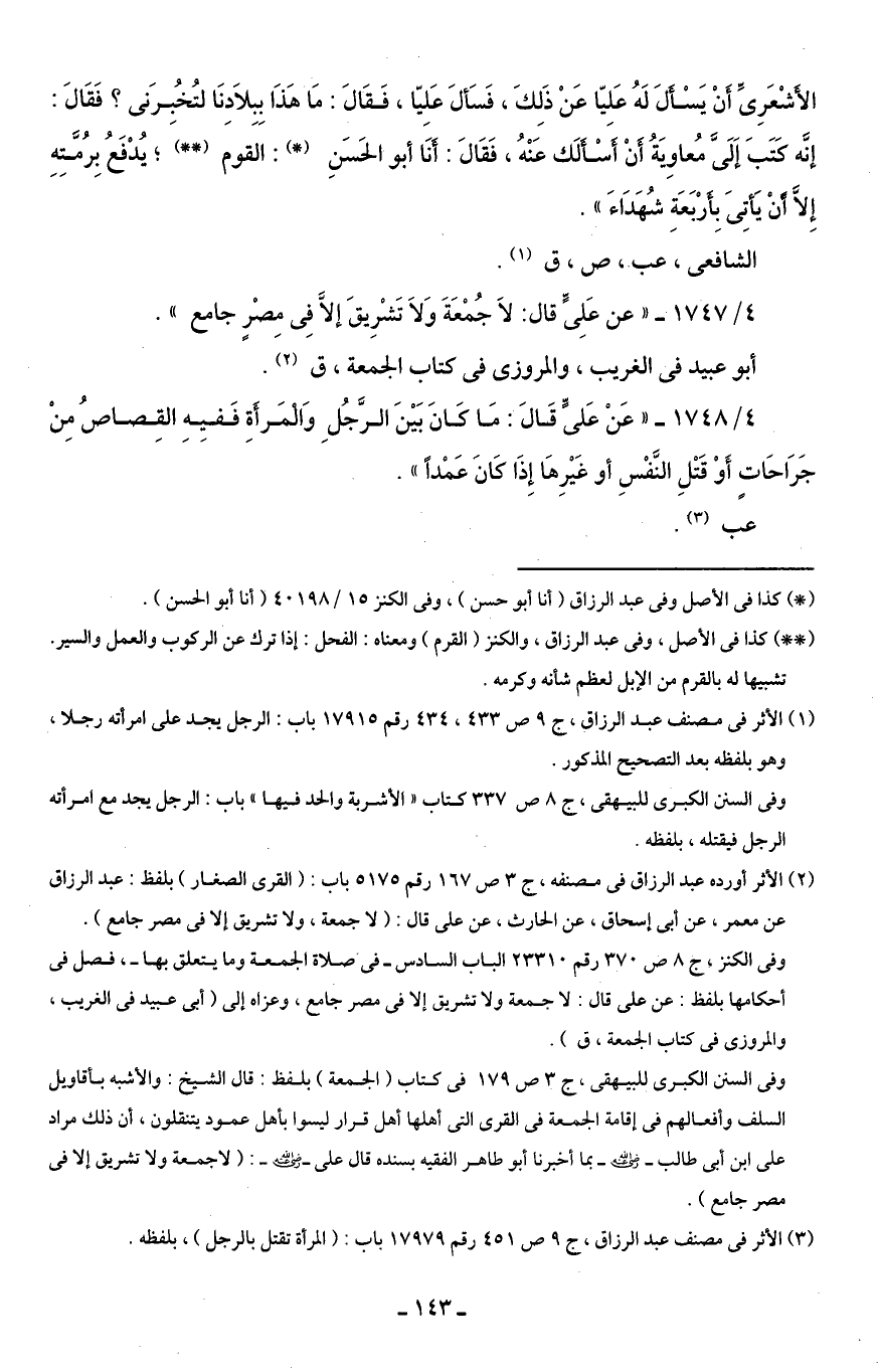 (¬2) الأثر أورده عبد الرزاق في مصنفه، ج 3 ص 167 رقم 5175 باب: (القرى الصغار) بلفظ: عبد الرزاق عن معمر، عن أبي إسحاق، عن الحارث، عن على قال: (لا جمعة، ولا تشريق إلا في مصر جامع).