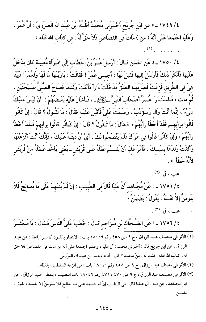 4/ 1750 - "عَن الحسنِ قالَ: أَرْسلَ عُمَرُ بْنُ الخَطَّابِ إلَى امْرَأَةٍ مُغيبَةٍ كان يدْخُلَ عَلَيها فَأَنْكَرَ ذَلِكَ فَأَرْسَلَ إِليها فَقيلَ لَهَا: أَجِيبِى عُمَرَ! فَقالَتْ: يَا وَيْلَهَا مَا لَهَا وَلِعُمَرَ! فَبَيْنَا هِىَ فِى الطَّرِيقِ فَزِعَتْ فَضَرَبَهَا الطَّلْقُ فَدَخَلَتْ دَارًا فَأَلْقَتْ وَلَدَهَا فَصَاحَ الصَّبِيُّ صَيْحَتَيْنِ، ثُمَّ مَاتَ، فَاسْتَشَارَ عُمَرُ أَصْحَابَ النَّبِيِّ - صلى الله عليه وسلم -، فَأَشَارَ عَلَيْهِ بَعْضُهُمْ: أَنْ لَيْسَ عَلَيْكَ شَىْءٌ، إِنَّما أَنْتَ وَالٍ وَمؤَدِّبٌ، وَصَمَتَ عَلِيٌّ فَأَقْبَلَ عَلَيْهِ فقَالَ: مَا تَقُولُ؟ قَالَ: إنْ كَانُوا قَالُوا برأيِهِم فَقَدْ أَخْطَأَ رَأيُهُمْ، فَقَالَ: مَا تَقُولُ؟ قَالَ: إنْ كَانُوا قَالُوا بِرأيِهِمْ فَقَدْ أَخْطَأَ رَأيُهُمْ، وَإنْ كَانُوا قَالُوا فِى هَوَاكَ فَلَمْ يَنْصَحُوا لَكَ، أَىْ أَنَّ دِيتَهُ عَلَيْكَ، فَإِنَّكَ أَنْتَ أَفْزَعْتَهَا وَأَلقَتْ وَلدَهَا بِسَببِكَ. فَأَمَرَ عَلِيّا أَنْ يُقَسِّمَ عَقْلَهُ عَلَى قُرَيْشٍ - يَعْنِى يَأخُذَ عَقْلَهُ مِنْ قُرَيْشٍ لأَنَّهُ خَطَأٌ".