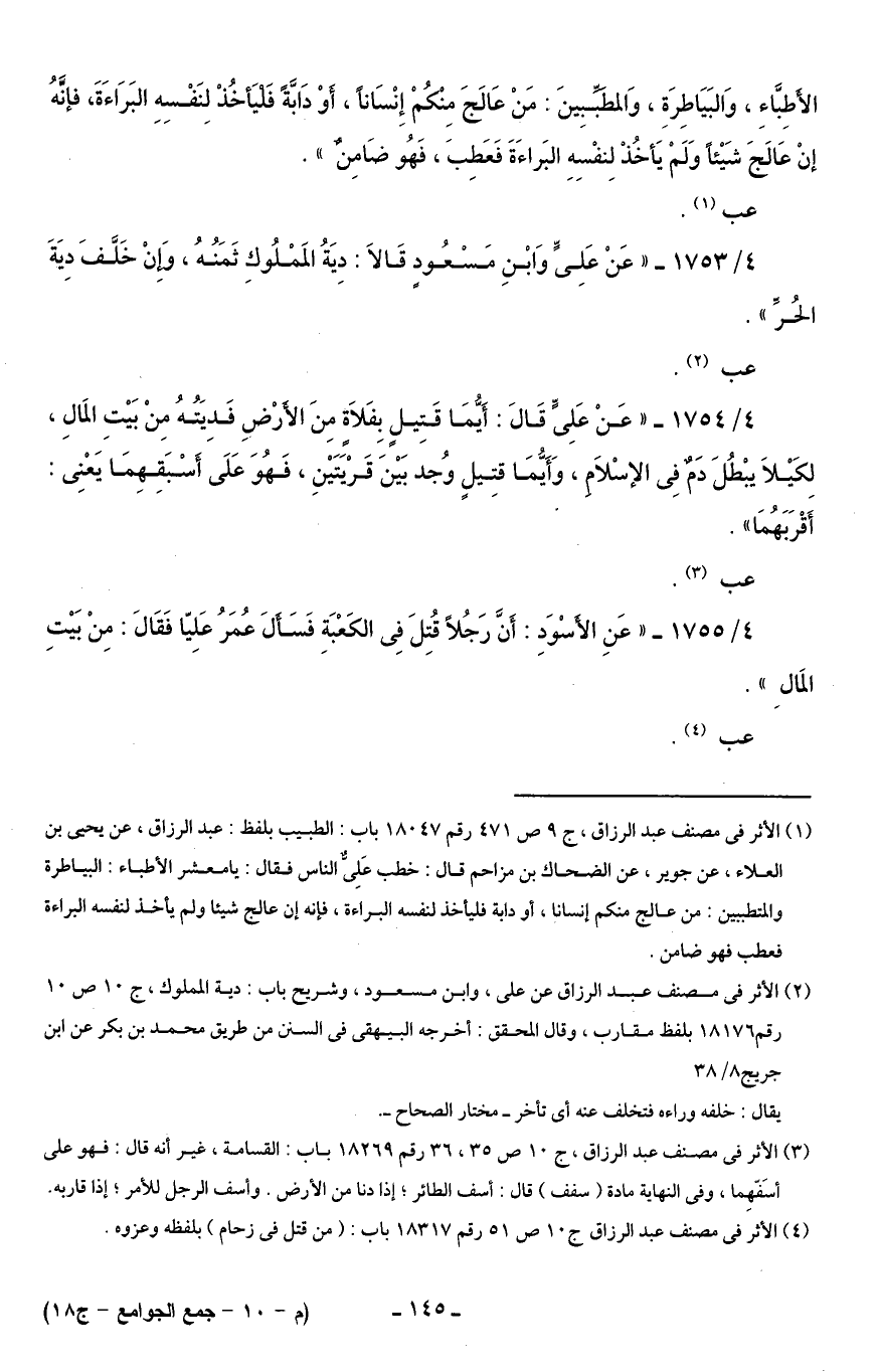 (¬1) الأثر في مصنف عبد الرزاق، ج 9 ص 471 رقم 18047 باب: الطبيب بلفظ: عبد الرزاق، عن يحيى بن العلاء، عن جوير، عن الضحاك بن مزاحم قال: خطب عَلِىٌّ الناس فقال: يا معشر الأطباء: البياطرة والمتطببين: من عالج منكم إنسانا، أو دابة فليأخذ لنفسه البراءة، فإنه إن عالج شيئا ولم يأخذ لنفسه البراءة فعطب فهو ضامن.