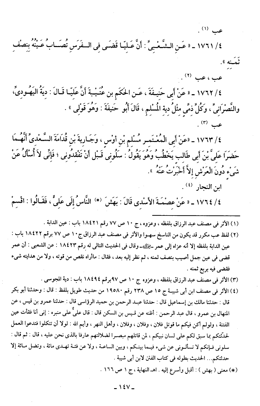 4/ 1762 - "عَنْ أَبِى حَنِيفَةَ، عَن الحَكَم بن عُتَيْبةَ أَنَّ عَلِيّا قَالَ: دِيَةُ اليَهُودِىَّ، والنَّصْرَانِىَّ، وَكُلِّ ذِمَّىٍ مِثْلُ دِيةِ المُسْلِمِ، قَالَ أَبُو حَنيفَةَ: وَهُوَ قَوْلِى".