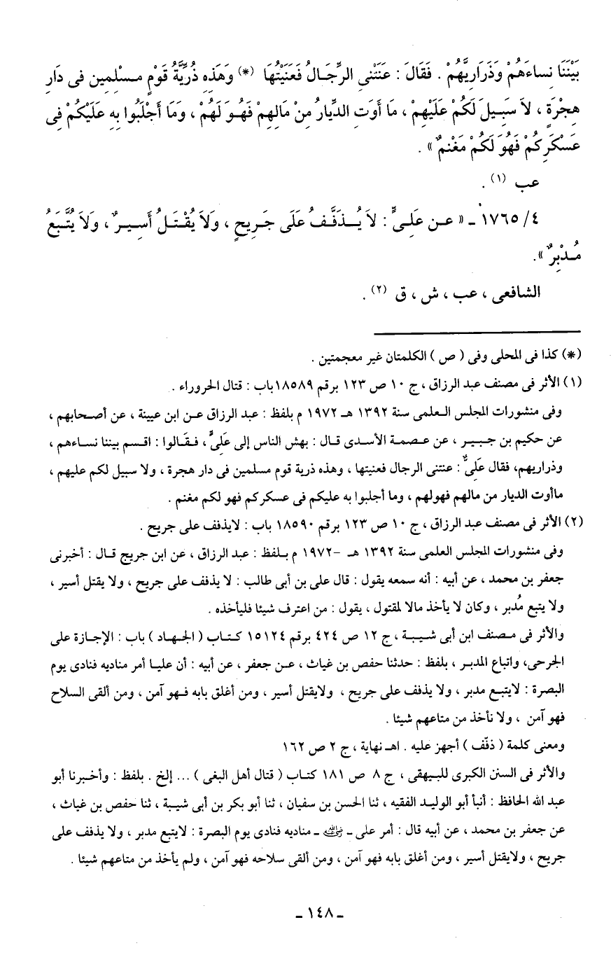 وفى منشورات المجلس العلمى سنة 1392 هـ - 1972 م بلفظ: عبد الرزاق، عن ابن جريج قال: أخبرنى جعفر بن محمد، عن أبيه: أنه سمعه يقول: قال على بن أبى طالب: لا يذفف على جريح، ولا يقتل أسير، ولا يتبع مُدبر، وكان لا يأخذ مالا لمقتول، يقول: من اعترف شيئا فليأخذه.
