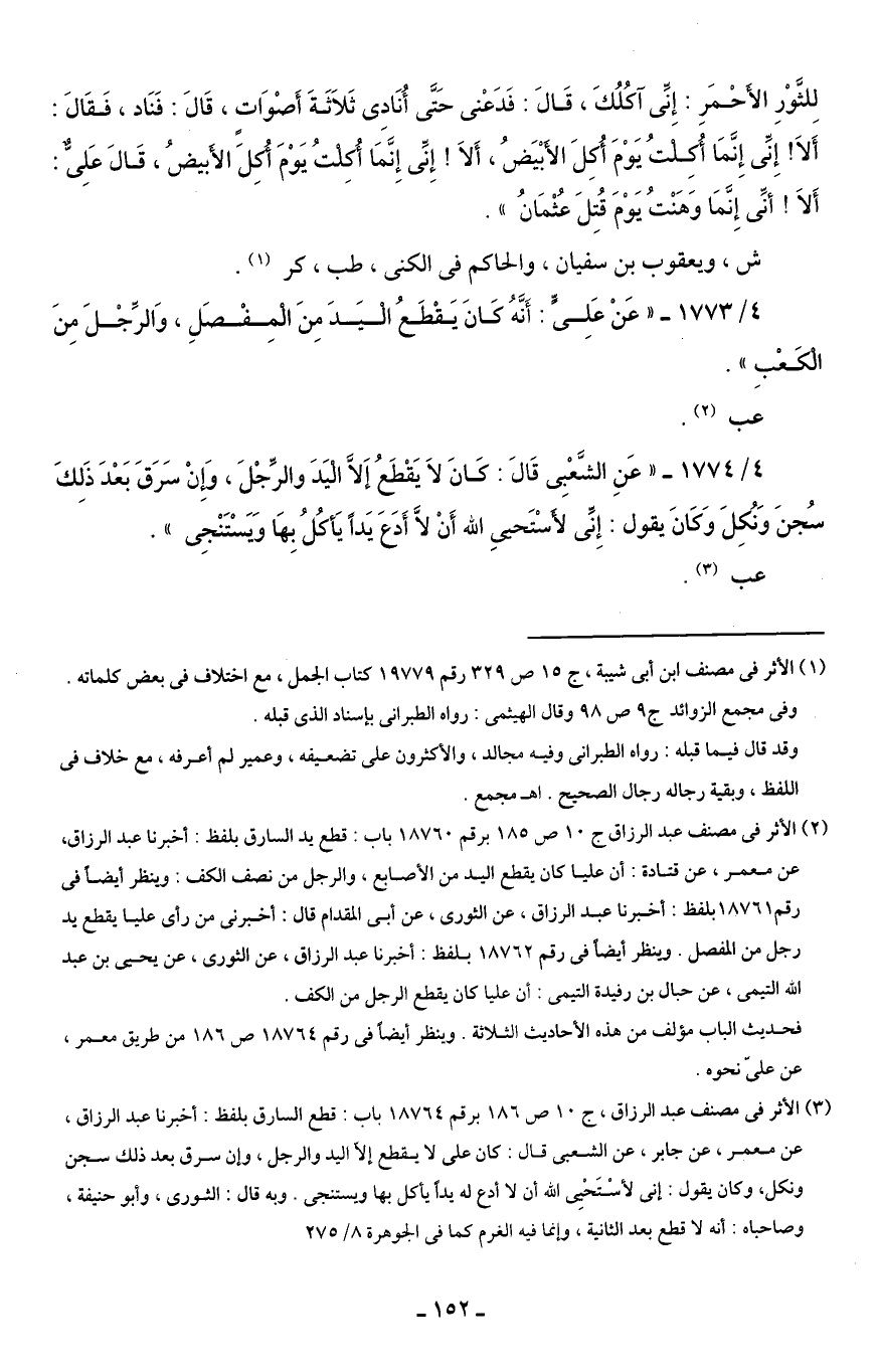 (¬2) الأثر في مصنف عبد الرزاق ج 10 ص 185 برقم 18760 باب: قطع يد السارق بلفظ: أخبرنا عبد الرزاق، عن معمر، عن قتادة: أن عليا كان يقطع اليد من الأصابع، والرجل من نصف الكف: وينظر أيضًا في رقم 18761 بلفظ: أخبرنا عبد الرزاق، عن الثورى، عن أبى المقدام قال: أخبرنى من رأى عليا يقطع يد رجل من المفصل. وينظر أيضًا في رقم 18762 بلفظ: أخبرنا عبد الرزاق، عن الثورى، عن يحيى بن عبد الله التيمى، عن حبال بن رفيدة التيمى: أن عليا كان يقطع الرجل من الكف.